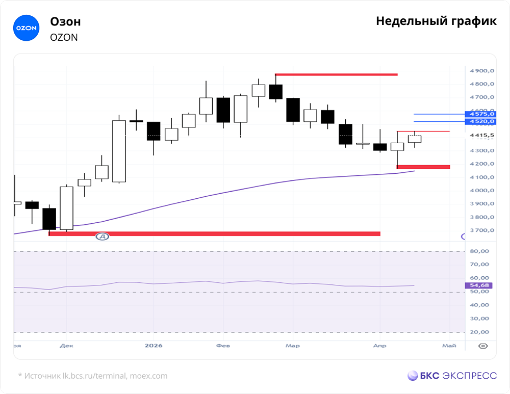 Мнение БКС Экспресс. Акции компании Ozon на предыдущей торговой сессии поднялись на 1,48%, закрывшись на отметке 4427 рублей. Бумаги показали себя лучше рынка, а объем торгов достиг 1,36 миллиарда рублей. Краткосрочная перспектива • В понедельник покупатели начали активно действовать. Дневная структура намекает на возможные цели роста: 4515 и 4589 рублей. Текущий максимум зафиксирован на уровне 4450 рублей, и для продолжения восходящего тренда необходимо преодолеть эту отметку. • Пока поддержка на уровне 4324 рублей не пробита, инициатива остается за покупателями, и сценарий роста остается актуальным. • На дневном графике индикатор RSI находится на уровне 49 пунктов. На 4-часовом таймфрейме котировки располагаются между 50- и 200-дневной скользящими средними. Основное внимание уделяется уровням сопротивления и поддержки: 4575 и 4324 рубля соответственно. Внешний фон • Индекс S&P 500 в понедельник снизился на 0,19%, но утром вырос на 0,2%. Азиатские индексы демонстрируют разнонаправленную динамику. Нефть Brent в понедельник подорожала на 5,64%, но утром подешевела на 0,9%. Уровни сопротивления и поддержки: - Сопротивление: 4450 / 4575 / 4877 рублей - Поддержка: 4324 / 4167 / 3662,5 рублей Долгосрочная перспектива • На недельном графике сформировался первый импульс падения после пробоя максимума предыдущей недели на уровне 4448 рублей. • Пробой уровня 4448 открыл путь к целям отскока, которые находятся в диапазоне 4520–4575 рублей. • Локальные цели движения отслеживаются в краткосрочной перспективе. В долгосрочной картине основное внимание уделяется закрытию недельной свечи в конце торгов пятницы. • Ozon занимает второе место по величине среди платформ электронной коммерции в России после Wildberries. Финансовые результаты Компания представила отчетность за 2023 год по МСФО: - Выручка за IV квартал выросла на 43% до 309,4 млрд рублей, а за весь 2023 год — на 63% до 998,0 млрд рублей. - Скорректированный показатель EBITDA увеличился на 26,4 млрд рублей до 43,2 млрд рублей в IV квартале и на 116,3 млрд рублей до 156,4 млрд рублей за год. - Прибыль в IV квартале выросла до 3,7 млрд рублей после убытка в 17,6 млрд рублей годом ранее. В 2023 году компания вышла в плюс, получив прибыль в размере 0,9 млрд рублей, в то время как годом ранее был зафиксирован убыток в 59,4 млрд рублей. - Чистый денежный поток от операционной деятельности сократился на 10 млрд рублей до 157,6 млрд рублей. За год этот показатель вырос на 217,3 млрд рублей и составил 503,6 млрд рублей. - Число пунктов выдачи заказов (ПВЗ) увеличилось на 40% до 84 тысяч. Прогноз на 2024 год Компания планирует выйти на чистую прибыль. Оборот (GMV) с учетом услуг должен вырасти на 25–30% по сравнению с предыдущим годом. Скорректированный показатель EBITDA ожидается на уровне 200 млрд рублей. Аналитики БКС сохраняют позитивный взгляд на акции Ozon. Целевая цена на горизонте года составляет 6400 рублей за акцию. Автор: Мамонтов Андрей Данный материал носит информационный характер и [не является индивидуальной инвестиционной рекомендацией](https://mondiara.com/communities?open=community-1163) или предложением о покупке или продаже указанной ценной бумаги. Источник: bcs-express.ru