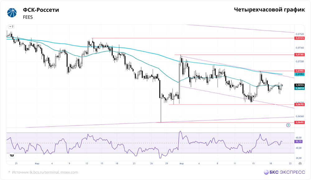 Мнение БКС Экспресс Краткосрочная картина В понедельник акции ФСК-Россети немного выросли в цене, несмотря на низкую торговую активность. Российские акции в целом двигались разнонаправленно: индекс МосБиржи вырос на 1,09%, а бенчмарк с вечерней сессией — на 0,96%. Утром акции Россетей подорожали, но после открытия основной сессии их рост замедлился. Ближе к середине дня наметился разворот, который вернул цену к исходному уровню. По итогам дня сформировалась свеча с небольшим белым телом и длинными тенями, что в условиях бокового движения акций — нейтральный сигнал. С апреля волатильность бумаг снизилась, они движутся в узком нисходящем канале. Свечные паттерны нечеткие, что говорит о низком интересе со стороны покупателей. В таких условиях акции могут продолжить снижаться, ища новую равновесную цену. Разворот возможен при достижении важных уровней поддержки, например, линии от октября 2025 года на 0,0657 руб. Но лучше дождаться фактического разворота. Индикатор RSI показывает, что потенциал для дальнейшего снижения есть, а перепроданности пока нет. Внешний фон Индекс S&P 500 в понедельник снизился на 0,24%, а фьючерсы на него утром немного выросли. Азиатские индексы двигаются разнонаправленно. Цена на нефть Brent на Мосбирже выросла на 3,41%, а на мировых площадках — на 0,8% до $90,9. Уровни сопротивления: 0,07092; 0,07282; 0,07474. Уровни поддержки: 0,067; 0,065; 0,0622. Долгосрочная картина Долгосрочная динамика акций задается нисходящим трендом от января 2011 года. С исторического максимума они потеряли 86%. В последние месяцы акции продолжили снижаться и снова опустились ниже 200-дневной скользящей средней. На прошлой неделе бумаги закрылись нейтральной свечой «Доджи», что в условиях слабости акций можно рассматривать как нейтральный сигнал. Аналитики БКС считают перспективы акций ФСК-Россети негативными. Их цель на год — 0,07 руб. Автор: Решетников Олег Данный материал носит информационный характер и [не является индивидуальной инвестиционной рекомендацией](https://mondiara.com/communities?open=community-1163) или предложением о покупке или продаже указанной ценной бумаги. Источник: bcs-express.ru