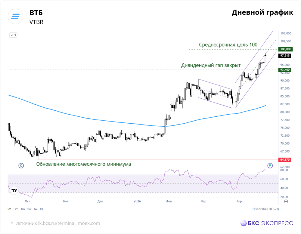Мнение БКС Экспресс. Вчера акции ВТБ выросли на 2,82%, до 98,1 руб., при объеме торгов 8,7 млрд руб. На утро акции подешевели на 0,33% до 97,78 руб. Краткосрочная перспектива Акции ВТБ заметно подорожали на фоне высокого торгового оборота. Среднесрочный рост бумаг обусловлен значимыми корпоративными событиями и улучшением технической картины. Недавно акционеры одобрили конвертацию привилегированных акций в обыкновенные, упрощая структуру капитала. Закрытие дивидендного гэпа прошлого года также сыграло роль. Однако основным драйвером остаются ожидания сохранения высоких дивидендов. Ясность по этому вопросу ожидается в конце апреля. Акции ВТБ закрылись выше 200-часовой средней цены, что сохраняет позитивную краткосрочную техническую картину. Высокий утренний уровень индикатора RSI указывает на состояние перекупленности. Сегодня акции могут стабилизироваться в диапазоне 96,5–99 руб. Среднесрочной целью теперь является круглая отметка 100 руб. Внешний фон Индекс S&P 500 снизился на 0,24%. Фьючерс на S&P 500 утром растет на 0,2%. Азиатские индексы в основном растут. Нефть Brent подешевела на 0,7% до $94,9 за баррель. Уровни сопротивления: 98,8, 99, 100 Уровни поддержки: 97,4, 96,5, 95,7 Долгосрочная перспектива В конце января акции ВТБ превысили 200-дневную среднюю цену после дивидендного гэпа, что является позитивным сигналом. Однако долгосрочная техническая картина остается негативной из-за многолетней слабости актива. Волатильные акции ВТБ могут резко менять динамику на фоне важных новостей. Целевая цена аналитиков БКС на год — 110 руб., +12%. Оценка бумаги — «Нейтральная». Автор: Манжос Виталий Данный материал носит информационный характер и [не является индивидуальной инвестиционной рекомендацией](https://mondiara.com/communities?open=community-1163) или предложением о покупке или продаже указанной ценной бумаги. Источник: bcs-express.ru