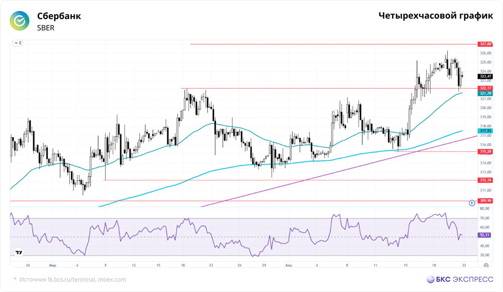 Мнение БКС Экспресс. Акции Сбербанка во вторник упали на 0,56%, завершив день на уровне 323,47 руб. Объём торгов был средним — 7,6 млрд руб. Утром в среду бумаги выросли на 0,2%. Краткосрочная перспектива • Во вторник акции Сбербанка скорректировались на фоне умеренной торговой активности. Российские акции в целом показали разнонаправленную динамику. Индекс МосБиржи прибавил 0,15% по итогам основной сессии, а к закрытию дня вырос на 0,2% по сравнению с вечером понедельника. • В первой половине дня акции Сбербанка демонстрировали нисходящую динамику, достигнув уровня поддержки 322,2 руб. С этой отметки произошёл отскок, но вечером падение продолжилось. • Днём акции закрылись небольшой чёрной свечой с длинной тенью снизу, что указывает на возможный разворот, о котором говорилось в предыдущем обзоре. Сигнал негативный, но сдержанный. • Существует потенциал для дальнейшего снижения, так как акции остаются вблизи зоны перекупленности по RSI. • На рынке отсутствуют явные драйверы, которые могли бы существенно повлиять на цену акций. В таких условиях рекомендуется действовать осторожно: фиксировать прибыль частями в диапазоне 322–330 руб., а к покупкам возвращаться при снижении до уровня 309–315 руб. Внешний фон • Индекс S&P 500 во вторник снизился на 0,62%, а фьючерс на этот индекс утром вырос на 0,1%. Азиатские фондовые индексы движутся разнонаправленно. Фьючерсы на нефть марки Brent на Мосбирже выросли на 4,69% по сравнению с закрытием понедельника, но на мировых рынках цена нефти снизилась на 0,7% и составляет $94,3 за баррель. Уровни сопротивления: 327, 330,4, 339. Уровни поддержки: 322,2, 315,3, 312,2. Долгосрочная перспектива • Акции Сбербанка торгуются на 17% ниже своего исторического максимума. В феврале 2022 года был пробит многолетний восходящий тренд, начавшийся в 2014 году. • Поддержку обеспечивает пологий растущий тренд, берущий начало от минимумов 2009 года. Акции уверенно росли до середины 2024 года, после чего началась коррекция. • Снижение котировок удалось остановить в декабре 2024 года благодаря решению Центрального банка не повышать ключевую ставку. Среднесрочный тренд изменился на восходящий. • Следующая среднесрочная цель — закрепление выше максимумов 2024 года, которые составляют 330 руб. • По итогам прошлой недели акции Сбербанка сформировали полнотелую белую свечу и обновили предыдущие максимумы. Это позитивный сигнал. Однако акции уже близки к состоянию перекупленности на недельном RSI, что может ограничить потенциал роста. • Аналитики БКС сохраняют позитивный взгляд на акции Сбербанка и прогнозируют цель на горизонте года на уровне 410 руб. Автор: Решетников Олег Данный материал носит информационный характер и [не является индивидуальной инвестиционной рекомендацией](https://mondiara.com/communities?open=community-1163) или предложением о покупке или продаже указанной ценной бумаги. Источник: bcs-express.ru