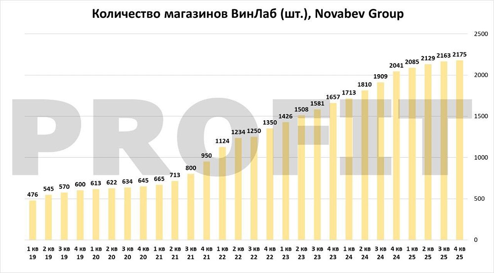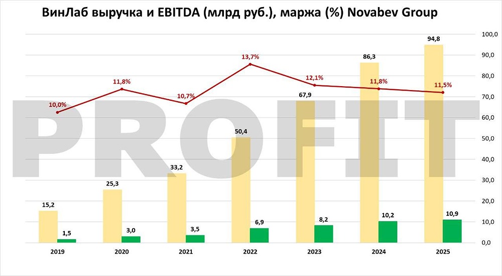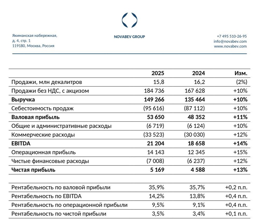 «Новабев» (бывш. «Белуга») опубликовала отчёт по МСФО за 2025 год. – пресс-релиз РЕЗУЛЬТАТЫ (год к году): • Отгрузки 15,8 млн дал (-2%) • Выручка ₽149,2 млрд (+10%) • Валовая прибыль ₽53,6 млрд (+11%) • Операционная прибыль ₽14,1 млрд (+15%) • EBITDA ₽21,2 млрд (+14%) • Чистая прибыль ₽5,1 млрд (+13%) • Прибыль на акцию — ₽56,1 (+39%) В июле 2025 «Винлаб» подвергся кибератаке, это повлияло на работу магазинов. В 2026 такого эффекта не будет. СМОТРЯ НА РЕЗУЛЬТАТЫ 2025 ГОДА ЭТО ВАЖНО УЧИТЫВАТЬ. Текущие мультипликаторы по 2025 г.: — P/E = 7,1 — P/S = 0,35 — EV/EBITDA = 3,36 — ДОЛГ/EBITDA = 0,91 За 1 полугодие уже выплатили 20₽ дивов на акцию, ~5% дивдоходности к текущей цене за 6 месяцев. Основная часть долга привязана к КС (в 2025 году долг стоил ~19% в среднем), по мере снижения КС нагрузка будет снижаться. В 2025 открыто 134 новых магазина, у «Винлаба» есть план достичь 4000 магазинов к 2029, удвоить выручку относительно 2025 и т.д. Почитать стратегию к 2029 году целиком можно на сайте ДЕРЖУ КОМПАНИЮ НА КАРАНДАШЕ Оценка уже нормальная, есть реальные перспективы роста бизнеса + скоро увидим эффект от снижения ставки. Очень хочется в 1 квартале увидеть рост в штуках, а не в рублях, и думаю, это так и будет. Активно наблюдаю Данный материал носит информационный характер и [не является индивидуальной инвестиционной рекомендацией](https://mondiara.com/communities?open=community-1163) или предложением о покупке или продаже указанной ценной бумаги. Источник: PROFIT