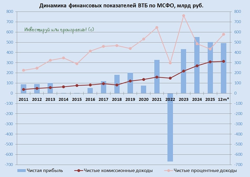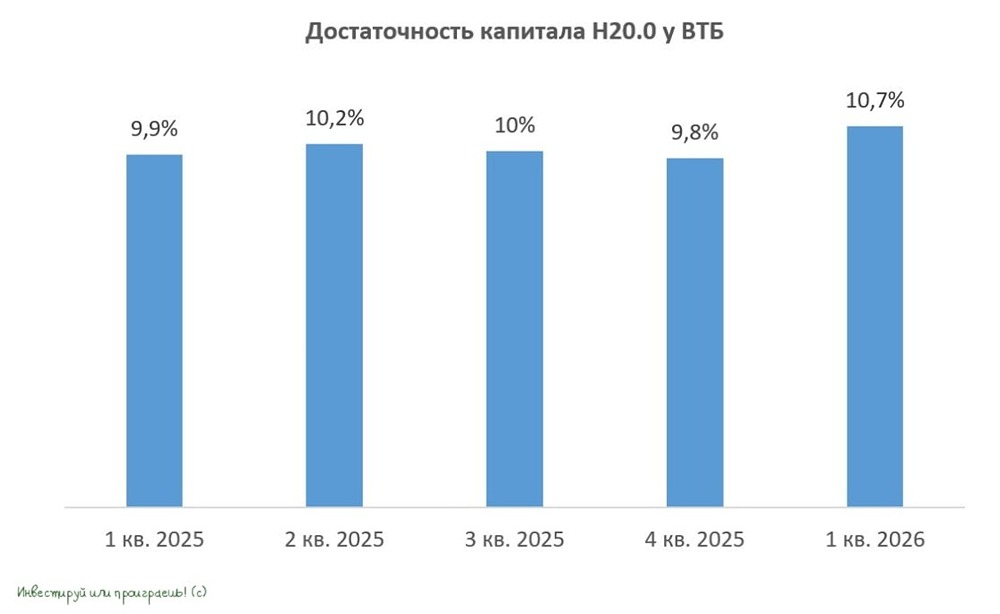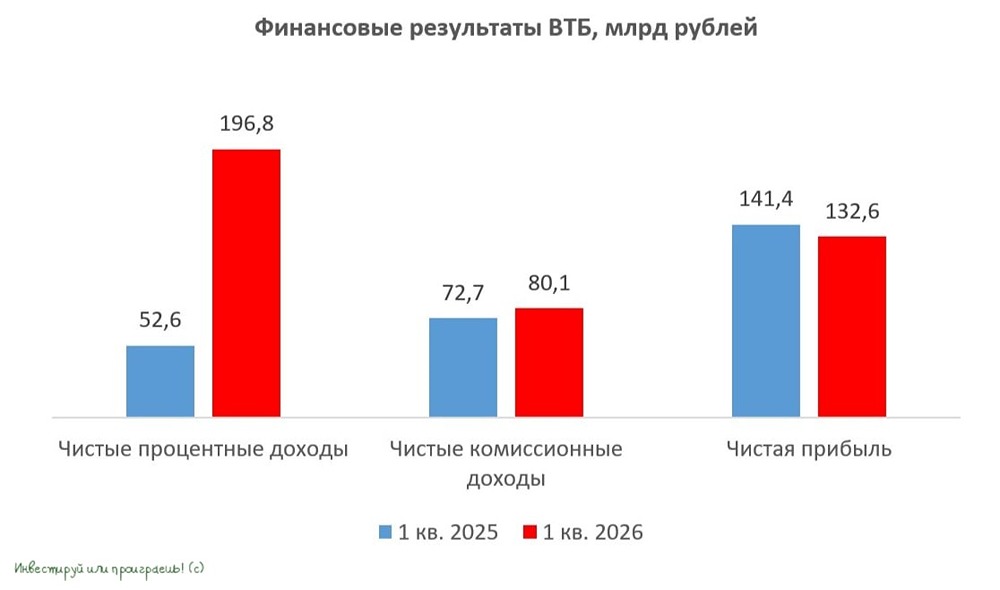 В последнее время инвестиционное инфополе буквально кишит различными новостями вокруг Банка ВТБ, а значит, самое время взглянуть на отчётность второго по величине российского банка по МСФО за 1 кв. 2026 года, которая была опубликована накануне. Чистые процентные доходы (ЧПД) с января по март выросли в 3,7 раза до 196,8 млрд руб. ВТБ более остро реагирует на изменение ключевой ставки, чем тот же [Сбер](https://t.me/invest_or_lost/7784), и на фоне смягчения денежно‑кредитной политики банк ловит попутный ветер: ставки по депозитам снижаются быстрее, чем по кредитам, как результат — рост процентной маржи. Кредитный портфель ВТБ вырос с начала года на +2,5% до 25,1 трлн руб. Однако за этими цифрами скрываются интересные тенденции: банк предпочитает развивать корпоративное кредитование, демонстрируя осторожность в рознице. Прошлый год наглядно показал, насколько рискованным может оказаться потребительское кредитование, и убытки стали горьким уроком. Качество кредитного портфеля при этом находится на приемлемом уровне: стоимость риска выросла на 0,1 п. п. до 0,9%. ➥ Чистые комиссионные доходы (ЧКД) увеличились на +10,2% (г/г) до 80,1 млрд руб. благодаря высокой транзакционной активности клиентов, особенно в сфере трансграничных платежей. ➥ Однако, несмотря на рост операционных доходов, отчётный период эмитент завершил со снижением чистой прибыли на -6,2% (г/г) до 132,6 млрд руб. Виной тому — опережающий рост издержек. Показатель рентабельности капитала (ROE) также снизился с 20,9% годом ранее до 19,2%, что тоже подтверждает давление на операционную эффективность банка. Вопрос операционной эффективности — давняя и, к сожалению, до сих пор не решённая проблема для ВТБ, которая тянется годами. После публикации отчётности менеджмент ВТБ провёл конференц-звонок, основные тезисы которого я предлагаю вашему вниманию: ✓ Руководство подтвердило прогноз по прибыли на 2026 год: 600–650 млрд руб. Корректировать прогнозный диапазон будут по итогам первого полугодия. ✓ Достаточность капитала по нормативу Н20.0 составляет 10,7% при регуляторном минимуме в 10%! Этого откровенно мало для выплаты 50% прибыли акционерам ВТБ. Сейчас идут переговоры с ЦБ по коэффициенту выплат. Наблюдательный совет соберётся в конце мая и вынесет рекомендацию: дивиденды составят от 25 до 50% чистой прибыли. ✓ Чистая процентная маржа на 2026 год таргетируется на уровне 3%. В последующих кварталах её рост ожидается за счёт смягчения ДКП и секьюритизации потребкредитов, выданных под высокие ставки. ✓ Менеджмент ВТБ ожидает снижения ключевой ставки до 12% к концу 2026 года. При этом финдиректор Дмитрий Пьянов отметил, что в ЦБ часто идут дискуссии о том, что инфляция должна составлять не 4%, а на некоторое время уйти даже ниже 4% (!!), и в этом контексте потребуется в течение длительного времени удерживать ставку на относительно высоком уровне (у нас уже [никаких сомнений](https://t.me/c/1515418228/3591) в этом нет!). ✓ Допэмиссия акций в 2026 году не планируется (а в 2027 году?). ✓ Минфин пока не проводил консультаций с менеджментом ВТБ по вопросу [windfall tax](https://t.me/invest_or_lost/7924). Конкретика от властей по налогу на сверхприбыль может появиться летом. Судя по всему, дивиденды ВТБ за 2025 год окажутся на уровне 25% от чистой прибыли (мой личный прогноз), и для участников рынка такой сценарий станет сильным разочарованием, поскольку многие инвесторы всё ещё наивно надею