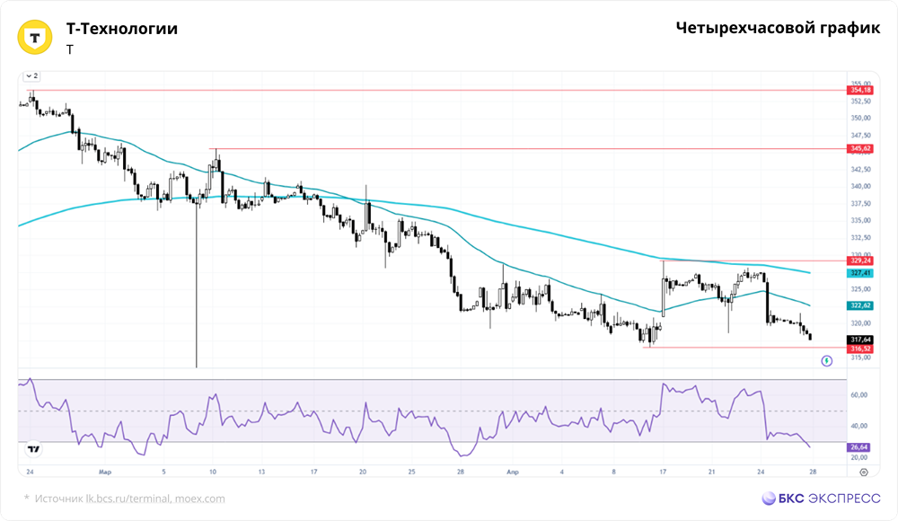 Мнение БКС Экспресс. В понедельник акции Т-Технологий снизились на 0,79% и закрылись на уровне 317,64 руб. Объем торгов был ниже обычного — 1,91 млрд руб. Утром во вторник бумаги немного выросли, прибавив 0,1%. Краткосрочная перспектива • В понедельник акции компании снизились на фоне низкого объема торгов. Рынок акций в целом показал снижение. Индекс МосБиржи вырос на 0,04% за основную сессию, но с учетом вечерней сессии закрылся в минусе на 0,38% по сравнению с пятницей. • Акции компании двигались вниз в течение дня, образовав небольшую черную свечу в районе минимумов. Экстремумы пятницы были обновлены, что указывает на негативный тренд. • Среднесрочная ситуация также ухудшилась. В пятницу акции вернулись ниже 200-дневной скользящей средней, а вчера была пробита восходящая тенденция от декабря 2024 года. • Сейчас акции тестируют зону минимумов 2026 года, которая является значимым уровнем поддержки. В пользу отскока от этого уровня говорит индекс относительной силы (RSI), который на коротких таймфреймах (1H, 4H) находится в зоне перепроданности, а на дневном графике близок к ней. • Нисходящая динамика индекса МосБиржи замедляется. Вчерашняя свеча уже не выглядит столь медвежьей, как в пятницу. Поддержка находится в районе 2700 пунктов. Запас для дальнейшего снижения ограничен, и возможно формирование бокового движения. • На текущих уровнях можно рассмотреть точечные покупки с расчетом на отскок в ближайшие недели. Однако входить в сделку лучше частями, оставляя часть капитала для усреднения в случае дальнейшего снижения. Внешний фон • Индекс S&P 500 в понедельник вырос на 0,12%, но фьючерс на индекс снизился на 0,1%. Азиатские фондовые индексы также снижаются. Фьючерс на нефть Brent на Мосбирже вырос на 1,81%, а на мировых площадках нефть торгуется в плюсе на 1,9% и стоит $104 за баррель. Уровни сопротивления: 329,2, 345,6, 354,2. Уровни поддержки: 316,5, 303,6, 300. Долгосрочная перспектива • Долгосрочный тренд акций восходящий, начавшийся в марте 2020 года. Исторические максимумы были на уровне 851,8 руб., но с тех пор котировки упали на 63%. • Ближайшая цель — слом нисходящего тренда от сентября 2023 года, который проходит около 357 руб. • С конца февраля акции постепенно снижались, но несколько недель назад появились признаки стабилизации. Позитивных факторов пока недостаточно для начала роста, но и серьезных признаков падения пока нет. Возможен небольшой откат вниз на фоне локальной слабости с последующим переходом в боковой тренд. Аналитики БКС считают акции Т-Технологий «позитивными» и прогнозируют цену в 430 руб. через 12 месяцев. Автор: Решетников Олег Данный материал носит информационный характер и [не является индивидуальной инвестиционной рекомендацией](https://mondiara.com/communities?open=community-1163) или предложением о покупке или продаже указанной ценной бумаги. Источник: bcs-express.ru