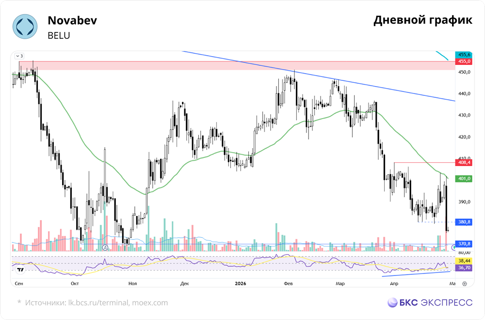 Мнение БКС Экспресс. Акции Novabev потеряли в цене 5,33% в понедельник, достигнув 376,8 руб. Торги были активными — объем составил 728 млн руб. Утром во вторник бумаги снизились на 1% от закрытия понедельника. Краткосрочная ситуация • Акции Индекса МосБиржи не имели четкого направления. Индекс вырос на 0,04% за основную сессию, но на вечерних торгах снизился на 0,2% по сравнению с закрытием воскресенья. • С конца марта акции Novabev падали после выхода из узкого бокового диапазона. Попытка стабилизироваться около 400 руб. не удалась, и цена опустилась до 381 руб. В конце апреля акции попытались восстановиться, но этому помешали два фактора. • Банк России на апрельском заседании снизил ключевую ставку на 50 базисных пунктов, но сохранил осторожность. Это не дало оснований для ожидания ускорения смягчения монетарной политики. Показатели устойчивого роста цен не снизились, а неопределенность из-за внешних и внутренних факторов, включая бюджетную политику, сохраняется. • Совет директоров Novabev рекомендовал дивиденды за 2025 год в размере 10 руб. на акцию вместо прогнозируемых 18 руб. Это вызвало разочарование инвесторов, что привело к массовому сбросу акций. Активность торгов была максимальной с ноября 2025 года, а дневной результат оказался худшим с апреля 2025 года. • Переговоры между Россией и Украиной не приносят позитивных изменений. Минфин готовится возобновить операции на валютном рынке, что поддерживает рубль. В целом, ситуация не способствует быстрому развороту рынка и акций Novabev. • Драйверов для роста по-прежнему недостаточно. Вчерашняя свеча ухудшила технический анализ, указывая на возможное тестирование уровня 370,8 руб. Несмотря на бычью дивергенцию по RSI, поддержка находится около 345 руб. Внешний фон В понедельник S&P 500 вырос на 0,12%. Фьючерс на S&P 500 сегодня в плюсе на 0,1%. Индексы АТР преимущественно в красной зоне. Нефть Brent утром выросла на 2%, достигнув $103,7 за баррель. Уровни сопротивления: 408,4 / 426 / 455 Уровни поддержки: 370,8 / 344,8 / 333,6 Долгосрочная перспектива • С октября 2024 года акции Novabev остаются ниже 200-дневной средней цены. Попытки подняться выше этой границы в марте 2026 года не увенчались успехом. Нисходящий тренд с апреля 2024 года был сломлен в январе 2026 года. • В ноябре прошлого года акции Novabev приостановили снижение и вернулись выше 400 руб. После публикации смешанных операционных результатов за 2025 год, цена коснулась 455 руб. Суммарные отгрузки в 2025 году снизились на 2% до 15,8 млн декалитров. Розничные продажи сети ВинЛаб выросли на 8,4%, а количество торговых точек увеличилось на 134 до 2175. Компании удалось сохранить результаты на уровне 2024 года в условиях стагнации отрасли. • Март закрылся медвежьей свечой. Позитивный эффект от бычьего пинбара февраля не оправдался, что указывает на усиление позиций продавцов. • Долгосрочный рост акций может быть обусловлен успешным развитием бизнеса в розничном сегменте, включая премиальный алкоголь, а также расширением каналов продаж через маркетплейсы. Однако существуют неопределенности в отношении будущих дивидендов, риск перетока инвесторов в акции ВинЛаба, снижение спроса на продукцию компании из-за ухудшения благосостояния населения и регуляторные ограничения на продажу алкоголя. • Аналитики БКС прогнозируют целевую цену акций Novabev в 500 руб. на горизонте года с нейтральным взглядом. Автор: Смирнов Андрей 