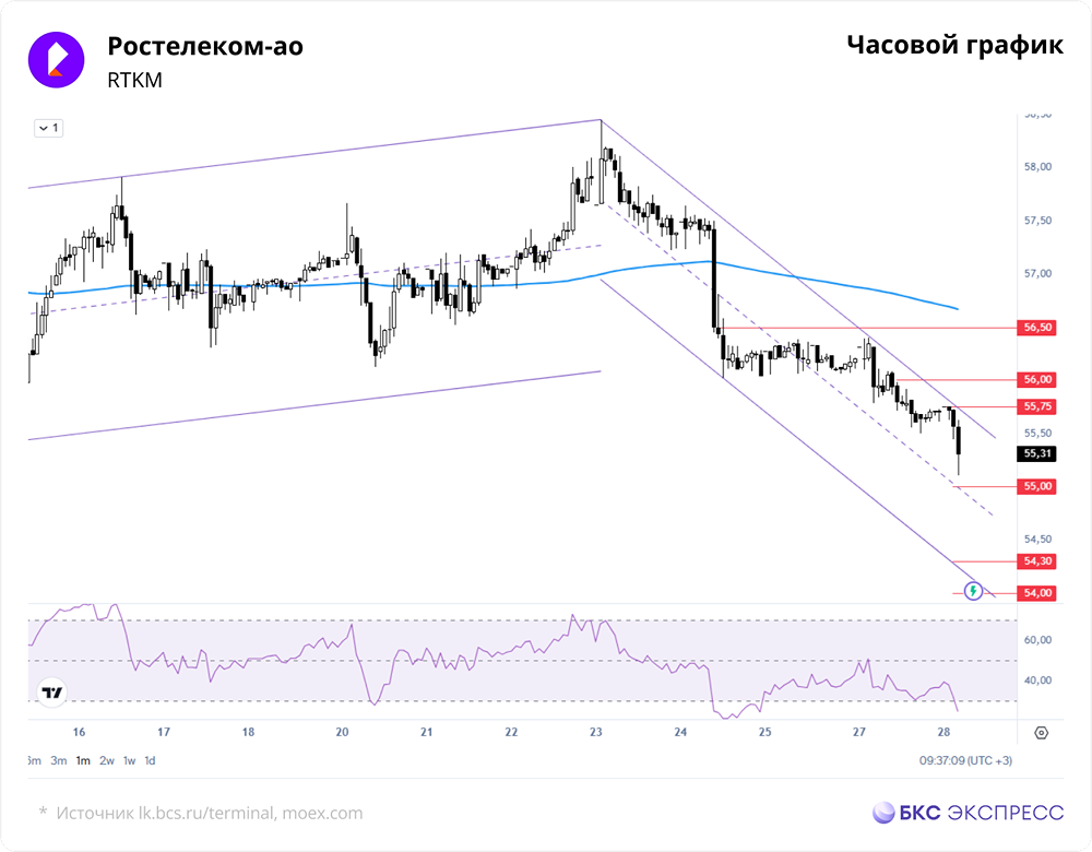 Мнение БКС Экспресс. Вчера акции Ростелекома снизились на 0,59%, до 55,71 руб. Объем торгов составил 0,2 млрд руб. Утром бумаги продолжили падать, потеряв еще 0,47%, до 55,45 руб. Краткосрочная перспектива • Акции телекоммуникационной компании продолжают снижаться, обновив двухнедельный минимум. Техническая картина на дневном графике ухудшилась, и бумаги могут упасть до многомесячного уровня поддержки в районе 54 руб. • Закрытие торгов прошло ниже 200-часовой скользящей средней, что указывает на умеренно негативную техническую картину. Низкий утренний показатель RSI на часовом графике свидетельствует о перепроданности. • В ближайшие дни акции Ростелекома, вероятно, продолжат тестировать уровень поддержки в районе 55 руб. Следующая значимая цель — 54 руб. Внешний фон • Индекс S&P 500 вырос на 0,12%. Фьючерсы на S&P 500 утром снижаются на 0,1%. Азиатские рынки демонстрируют разнонаправленную динамику. Нефть Brent подорожала на 1,2%, до 109,5 за баррель. Уровни сопротивления: 55,75 / 56 / 56,5 Уровни поддержки: 55 / 54,3 / 54 Долгосрочная перспектива • Акции Ростелекома долгое время не демонстрируют сильного роста и сейчас торгуются на уровне начала 2000-х. Это частично компенсируется тем, что они относятся к дивидендным бумагам. • В апреле 2026 года курс акций остается ниже 200-дневной скользящей средней. Однако долгосрочная техническая картина остается нейтральной из-за широкого диапазона. • Аналитики БКС прогнозируют целевую цену акций в 80 руб. через год, что составляет +45%. Их взгляд на бумагу — «позитивный». Автор: Манжос Виталий Данный материал носит информационный характер и [не является индивидуальной инвестиционной рекомендацией](https://mondiara.com/communities?open=community-1163) или предложением о покупке или продаже указанной ценной бумаги. Источник: bcs-express.ru