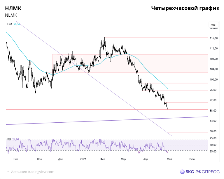 Мнение БКС Экспресс. Акции НЛМК во вторник, 28 апреля, снизились на 1,31%, завершив день на уровне 88,6 руб. Сегодня на утренней сессии наблюдается рост на 0,4%, и котировки остаются вблизи 89 руб. Краткосрочная динамика • На текущей неделе негативная тенденция в акциях НЛМК продолжилась. В понедельник инвесторы переключились на нефтегазовый сектор, а во вторник продавцы взяли верх. В результате акции НЛМК неоднократно пробивали дно года и опустились до минимумов с октября 2022 года. • Утром бумаги показывают умеренный рост. RSI на дневном и недельном графиках находится в зоне перепроданности, что увеличивает шансы на отскок. Однако без общерыночной поддержки это может быть сложно. • При развороте вверх акции должны преодолеть отметку 90 руб. Следующая цель — 92,2 руб., где проходит 200-часовая скользящая средняя. Уверенный пробой может подтолкнуть котировки к мартовским минимумам на 95,6 руб., а затем к апрельским пикам на 98,9 и 100 руб. • Нижняя поддержка сейчас находится на уровне 88,3 руб. Если цена опустится ниже, откроется дорога к границе восходящего тренда 2008, 2014 и 2022 годов, примерно 85 руб. Следующая важная опора — 80 руб., где заканчивается нисходящий тренд от максимумов 2025 года. Внешний фон • Индекс S&P 500 завершил вторник снижением на 0,49%, но утром фьючерсы показывают небольшой рост на 0,2%. Азиатские индексы, такие как Hang Seng и Shanghai Composite, растут на 1,2% и 0,4% соответственно. Японские биржи закрыты из-за национального праздника. Нефть Brent утром держится на уровне $111,2 за баррель. Уровни сопротивления: 90,3; 93,3; 95,6 Уровни поддержки: 88,3; 85; 80 Долгосрочная перспектива • Ослабление цикла ужесточения денежно-кредитной политики ЦБ и надежда на улучшение геополитической ситуации в конце 2024 года поддержали акции НЛМК. В 2025 году бумаги достигли максимума выше 168 руб., но затем, под давлением общерыночных настроений и неблагоприятной конъюнктуры на рынке стали, котировки снизились. • Отскок начался в июле 2025 года, когда акции вышли из нисходящего тренда. Попытки закрепиться выше 200-дневной скользящей средней закончились падением, которое привело к новым годовым минимумам. Осенью котировки восстановились, но сейчас бумаги снова переписали эти уровни. Есть риск выхода из восходящего тренда от исторических минимумов. • В черной металлургии пока не видно перспектив разворота. Ключевая ставка, по нашим прогнозам, останется высокой до конца 2026 года. Целевая цена акций НЛМК — 120 руб. Взгляд на перспективы — нейтральный. • Компания может выиграть от постепенного восстановления отрасли во второй половине 2026 года, особенно если ключевая ставка снизится и рубль ослабнет. Автор: Попова Анастасия Данный материал носит информационный характер и [не является индивидуальной инвестиционной рекомендацией](https://mondiara.com/communities?open=community-1163) или предложением о покупке или продаже указанной ценной бумаги. Источник: bcs-express.ru