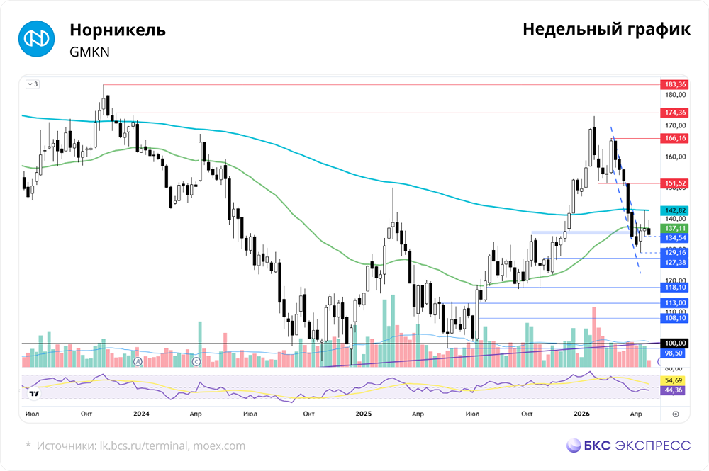 Мнение БКС Экспресс. Во вторник акции Норникеля упали на 1,37%, достигнув 135,22 руб. Объем торгов был чуть ниже среднего — 1,86 млрд руб. Сегодня утром бумаги потеряли еще 0,1% относительно закрытия вторника. Краткосрочная динамика • Акции Индекса МосБиржи торговались в красной зоне. Сам индекс упал на 1,31% по итогам основной сессии, а на вечерних торгах — на 1,29% по сравнению с закрытием понедельника. • Акции Норникеля теряли в цене первой половине дня. Максимальные потери составили 2,1%, что привело к тестированию поддержки на уровне 134,5 руб. После этого часть потерь была отыграна, и акции перешли к консолидации над этим уровнем до конца торгов. Свеча, сформировавшаяся на дневном графике, добавляет негатива в техническую картину. • Давление на акции Норникеля оказала нисходящая коррекция в платиноидах, которые вернулись к уровням октября 2024 г. Умеренные потери также испытали котировки меди, хотя обычно они более стабильны. На мировых рынках никель вырос. Опасения дефицита металла связаны с ограничением поставок серы, важной для кислотного выщелачивания руды. • Ослабление рубля стало положительным фактором. Участники рынка начали учитывать возможное возобновление операций Минфином на валютном рынке. Однако другие факторы сохраняли неопределенность. Монетарные сигналы от Банка России указывают на замедление снижения ключевой ставки. Переговоры между Россией и Украиной остаются на паузе. • В текущих условиях вероятность отскока от уровня 134,5 руб. невелика. Фундаментальные факторы и новостной фон оказывают сильное давление, что затрудняет формирование разворотных формаций. Если акции пробьют уровень 134,5 руб., следующей целью станет зона интереса покупателей 127,4–129,2 руб. • Поводы для разворота могут стать снижение геополитической напряженности в Восточной Европе или Ближнем Востоке. В первом случае может вырасти весь российский рынок. Во втором — возможно восстановление котировок золота и драгоценных металлов в целом. Внешний фон Во вторник S&P 500 упал на 0,49%. Сегодня фьючерсы на S&P 500 выросли на 0,1%. Азиатские индексы торгуются разнонаправленно. На мировых рынках платина снижается на 0,1%, палладий — на 0,7%, медь растет на 0,5%, никель — на 0,4%. Уровни сопротивления: 140,5, 143, 151,5 Уровни поддержки: 134,5, 127,4, 118,1 Долгосрочная перспектива Норникель представил хорошую отчетность за 2024 г. по МСФО: выручка составила $13,7 млрд (+10% г/г), EBITDA — $5,7 млрд (+9% г/г), свободный денежный поток — $1,6 млрд (+360% г/г). Чистый долг к EBITDA снизился с 1,9х до 1,6х. Однако производственные результаты за I квартал 2025 г. и планы на год снижают позитивные ожидания. Компания ожидает профицит по никелю в 2025 г., но дефицит по меди и платине. Рынок палладия, вероятно, будет сбалансированным, но избыточный инвестиционный спрос может создать дефицит. Мнение компании по меди поддерживают другие аналитики. Закрытие мартовской свечи дало медвежий сигнал, так как инициатива перешла к продавцам. Результат за месяц стал худшим с августа 2024 г. Апрельская свеча может закрыться в красной зоне, но если удастся избежать более глубокой коррекции, сигнал будет умеренно позитивным. В перспективе ожидается постепенное снижение ключевой ставки ЦБ до 13% к концу 2025 г. Пересмотр связан с риторикой регулятора, который указывает на внешние и бюджетные риски. Выплаты дивидендов возобновятся не раньше 2025 г. при 