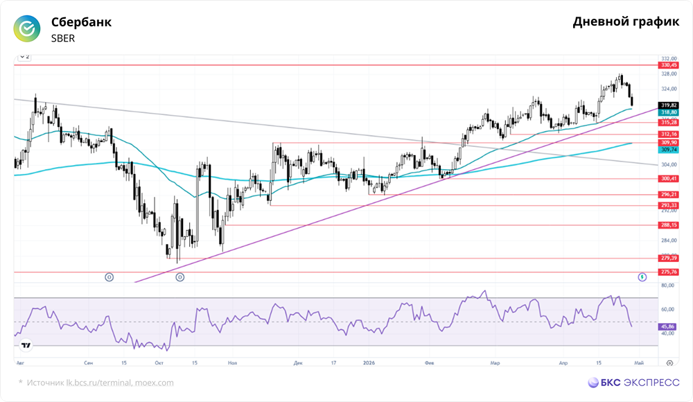Мнение БКС Экспресс. Акции Сбербанка во вторник снизились на 0,67%, закрывшись на уровне 319,82 руб. Объем торгов был средним — 6,3 млрд руб. Утром в среду акции выросли на 0,2%. Краткосрочная перспектива • Во вторник акции Сбербанка скорректировались на фоне умеренной торговой активности. Российский рынок акций продолжал снижаться. Индекс МосБиржи потерял 1,31% за основную сессию и завершил день в минусе на 1,29%, по сравнению с вечерней сессией понедельника. • В первый час основной торговой сессии акции компании резко упали, но затем стабилизировались чуть ниже 320 руб. • День завершился «медвежьей» свечой с средней амплитудой вблизи внутридневных минимумов. Это обновило нижнюю границу предыдущего дня. Сигнал был умеренно негативным. • В пятницу акции закрылись свечой «Доджи», что усилило риски отката от сильного сопротивления 327–330 руб. Это и произошло. Заявление Банка России оказалось жестким, что может определить направление движения рынка на первую половину недели. • На часовом таймфрейме наблюдается явная бычья дивергенция по RSI. На четырехчасовом графике индикатор вошел в зону перепроданности. Часовые свечи показывают первые признаки стабилизации, но полноценного разворотного сигнала пока нет. Дневной RSI опустился чуть ниже 50. • Индекс МосБиржи упал ниже 2700 пунктов и достиг минимумов 2026 года. Возможен более глубокий спад до 2675 пунктов, но пространство для снижения ограничено. По ключевым бумагам могут быть установлены локальные минимумы, после чего возможен отскок. • Сбербанк остается одной из самых устойчивых акций на российском рынке. Привлекательная доходность в рамках дивидендного сезона поддерживает котировки. • Стратегия остается прежней: рекомендуем фиксировать прибыль частями в диапазоне 322–330 руб. К покупкам безопаснее возвращаться при снижении до 312–317 руб. Внешний фон • S&P 500 во вторник снизился на 0,49%, а фьючерс на индекс утром вырос на 0,2%. Азиатские индексы сегодня растут. Фьючерс на Brent на Мосбирже во вторник вырос на 2,59%, но на мировых площадках нефть теряет 0,1%, оставаясь на уровне $104,3. Уровни сопротивления: 330,4 / 339 / 352,7 Уровни поддержки: 315,3 / 312,2 / 310 Долгосрочная перспектива • Акции торгуются на 17% ниже исторического максимума. В феврале 2022 года был пробит многолетний тренд, начавшийся в 2014 году. • Поддержка найдена на уровне пологого растущего тренда, берущего начало с минимумов 2009 года. Акции уверенно росли до середины 2024 года, после чего началась коррекция. • Снижение котировок удалось остановить в декабре 2024 года благодаря решению ЦБ не повышать ключевую ставку, что привело к смене среднесрочного тренда на восходящий. • Ближайшая среднесрочная цель — закрепление выше максимумов 2024 года на уровне 330 руб. • На прошлой неделе акции закрылись свечой «Доджи», что является сигналом к осторожности, так как цена близка к максимумам. Возможны предпосылки к откату. • Аналитики БКС сохраняют позитивный взгляд на акции Сбербанка, прогнозируя цель на уровне 410 руб. в горизонте года. Автор: Решетников Олег Данный материал носит информационный характер и [не является индивидуальной инвестиционной рекомендацией](https://mondiara.com/communities?open=community-1163) или предложением о покупке или продаже указанной ценной бумаги. Источник: bcs-express.ru