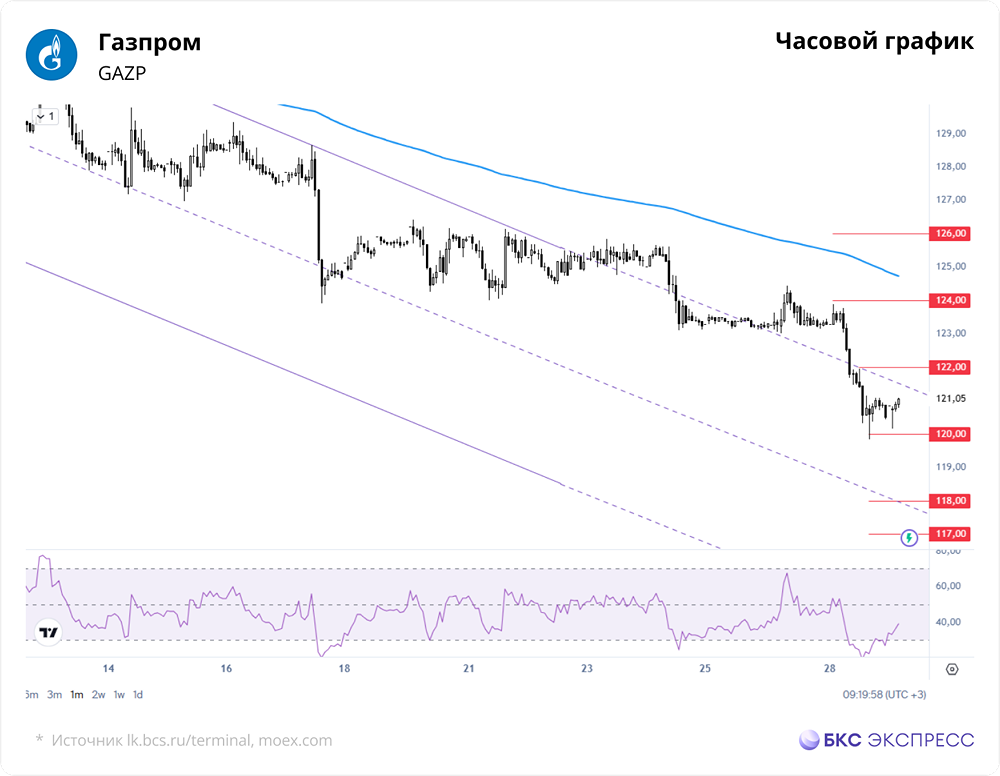 Мнение БКС Экспресс. Вчера акции Газпрома подешевели на 2,25%, до 120,51 руб. Объем торгов составил 6,3 млрд руб. Утром бумаги выросли на 0,45%, до 121,05 руб. Краткосрочная перспектива • Стоимость акций снизилась, но объемы торгов были средними. Акции Газпрома просели вместе с рынком, но индекс МосБиржи упал сильнее — на 1,36%. После падения ниже 123 руб. попытка преодолеть месячный тренд не удалась. Среднесрочные перспективы остаются неопределенными, ухудшаясь при закреплении ниже 119,5 руб. • Акции закрылись ниже 200-часовой скользящей средней, что ухудшило краткосрочную техническую картину. Низкий утренний RSI указывает на близость к перепроданности. • Вероятно, акции Газпрома стабилизируются в диапазоне 119–124 руб. После просадки распродажи могут ослабнуть из-за перепроданности, но резкого отскока пока нет. Внешний фон • Индекс S&P 500 снизился на 0,49%, фьючерсы на него утром растут на 0,2%. Азиатские индексы показывают разнонаправленную динамику. Нефть Brent подорожала на 0,3% до $111,6 за баррель. Уровни сопротивления: 122, 124, 126 Уровни поддержки: 120, 118, 117 Долгосрочная перспектива • У акций Газпрома нет ярко выраженных долгосрочных трендов — последний был утрачен в прошлом году. Котировки движутся в боковом тренде, который может сохраняться долго. В 2013–2017 гг. акции торговались в диапазоне 130–155 руб. Более широкий диапазон с учетом выбросов — 110–170 руб. • Значительный рост от текущих уровней затруднен из-за множества старых сопротивлений и ухудшения фундаментальных факторов, включая сокращение поставок газа в Европу. В 2023 году Газпром впервые за 25 лет получил годовой убыток, отказался от дивидендов и пока не возобновил их выплату. • Аналитики БКС оценивают акции Газпрома как «нейтральные», прогнозируя рост до 160 руб. (+32%) в течение года. Автор: Манжос Виталий Данный материал носит информационный характер и [не является индивидуальной инвестиционной рекомендацией](https://mondiara.com/communities?open=community-1163) или предложением о покупке или продаже указанной ценной бумаги. Источник: bcs-express.ru
