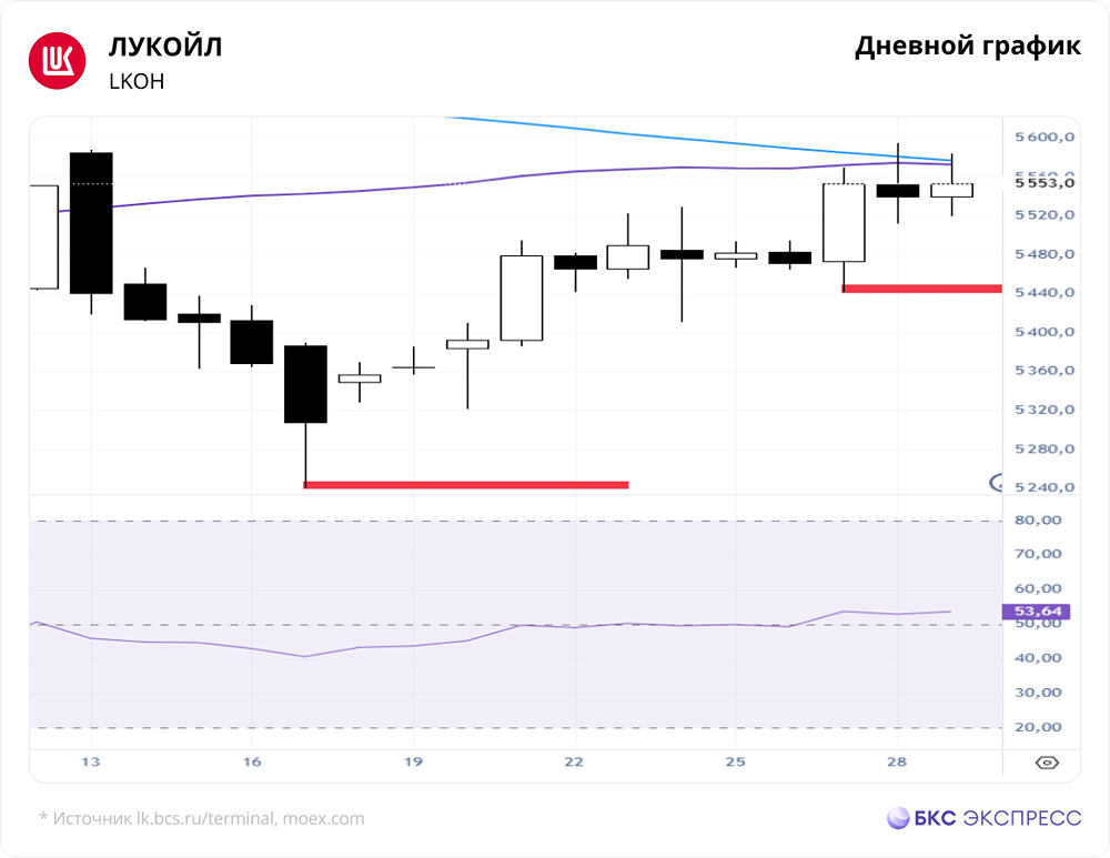 Мнение БКС Экспресс. Акции ЛУКОЙЛа на прошлой торговой сессии снизились на 0,23%, закрывшись на уровне 5540 руб. На фоне общего падения рынка бумаги показали себя лучше. Объем торгов составил 4,83 млрд руб. Краткосрочная перспектива Во вторник покупатели преодолели сопротивление на уровне 5587,5, подняв текущий максимум до 5595 руб. Долгосрочно начался отскок. Сценарий роста сохраняется, пока не будет сломана поддержка на уровне 5441,5. На дневном графике RSI находится на отметке 53 пункта. На 4-часовом графике бумаги торгуются между 50-дневной и 200-дневной скользящими средними. Основные уровни для наблюдения — сопротивления на 5704 руб. и поддержки на 5441,5 руб. Внешний фон Индекс S&P 500 потерял 0,49% во вторник, но утром отыграл часть потерь, поднявшись на 0,2%. Азиатские индексы торгуются разнонаправленно. Нефть марки Brent выросла на 2,8% во вторник, начав день с подъема на 0,8%. Уровни: Сопротивления: 5595, 5668, 5704 Поддержки: 5441,5, 5240,5, 5132,5 Долгосрочная перспектива На недельном графике волна падения завершилась после преодоления сопротивления на уровне 5587,5. Потенциальные цели роста — 5704–5773 руб. Пока поддержка на уровне 5441,5 не пробита, эти цели остаются актуальными. Совет директоров ЛУКОЙЛа рекомендовал выплатить финальные дивиденды за 2025 год в размере 278 руб. на акцию. Дата закрытия реестра для получения дивидендов — 4 мая 2026 года. Аналитики БКС сохраняют позитивный взгляд на акции ЛУКОЙЛа. Целевая цена на горизонте года — 7100 руб. за акцию. Автор: Мамонтов Андрей Данный материал носит информационный характер и [не является индивидуальной инвестиционной рекомендацией](https://mondiara.com/communities?open=community-1163) или предложением о покупке или продаже указанной ценной бумаги. Источник: bcs-express.ru