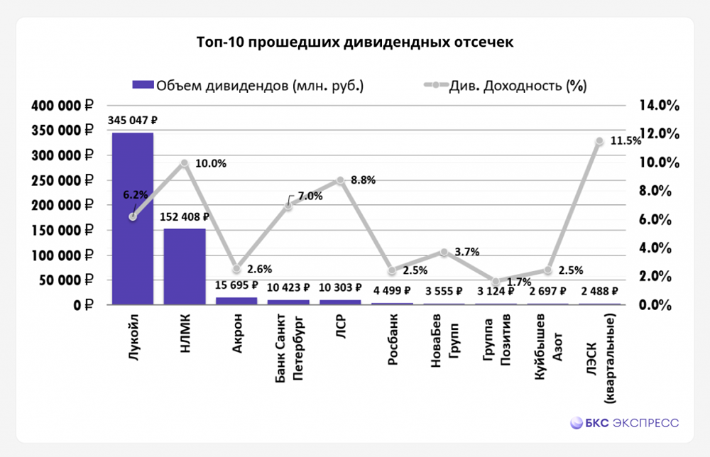 Мнение: БКС Мир Инвестиций. Самые высокие доходности этого сезона: Сургут-п, МТС, Россети центр, Россети МР и Сбербанк. Весенне-летний дивидендный сезон проходит с мая по июль — именно в это время проходят дивидендные отсечки по акциям многих компаний. Размеры дивидендных выплат при этом, как правило, являются самыми высокими, поскольку среди акционеров распределяется прибыль за прошедший календарный год. Есть и малые дивидендные сезоны: в начале октября и в конце декабря – начале января, по итогам которых выплачиваются дивиденды за полгода и девять месяцев соответственно. Однако не все компании выплачивают промежуточные дивиденды. Да и сами выплаты в эти временные промежутки чаще всего скромнее. Для того, чтобы получить дивиденды, необходимо удерживать акции на момент дивидендной отсечки — с учетом режима торгов Т+1 — за один рабочий день до закрытия реестра. Дивидендный сезон 2024 Формальной даты старта дивидендного сезона нет: его можно отсчитывать с начала мая или, например, с первой отсечки крупного эмитента, такого как ЛУКОЙЛ. В текущем сезоне отсечки обозначили уже более 60 эмитентов. Это не финальное число: некоторые компании еще не дали рекомендацию по выплате дивидендов, поэтому список будет дополняться. Со всеми предстоящими закрытиями реестра можно ознакомиться в дивидендном календаре. На диаграмме показаны размеры 10 крупнейших выплат по бумагам, реестр по которым уже закрыт, а также приведена их дивидендная доходность. Суммарный объем прошедших выплат превысил 550 млрд руб. При этом большая доля приходится на 2 компании: ЛУКОЙЛ (62,2%) и НЛМК (27,5%). Возглавляют топ привилегированные акции Сургутнефтегаза, доходность по которым на порядок выше конкурентов и составляет 17,38%. При этом обыкновенные акции компании предлагают доходность всего 2,68%. Средняя доходность по остальным девяти компаниям из топа составляет 10,49%. Ближайшие отсечки На диаграмме показаны ближайшие дивидендные отсечки, а также приведена дивидендная доходность по соответствующим бумагам. Лайфхак. Используя маржинальное кредитование, можно уже сегодня увеличить позиции в акциях, не дожидаясь фактической выплаты дивидендов. Размер рекомендованных дивидендов уже известен, и на эту величину можно купить еще акций, пока рынок не поднялся еще выше. Когда дивиденды поступят, маржинальные позиции за счет них можно будет закрыть. [Не является индивидуальной инвестиционной рекомендацией]