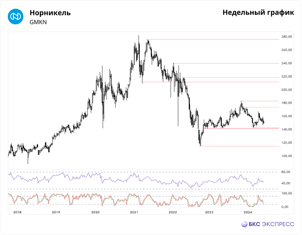 Мнение: БКС Мир Инвестиций. ГМК Норильский никель. Устойчивее рынка. На предыдущей торговой сессии акции Норникеля снизились на 2,12%, закрытие прошло на отметке 149,8 руб. Бумага выглядела лучше рынка, потерявшего 2,76%. Краткосрочная картина: - На торговой сессии понедельника акции Норникеля опустились ниже зоны 150–151 руб. на фоне негативного сентимента на рынке в целом. Бумаги второй день выглядят лучше рынка, несмотря на отказ от выплаты дивидендов за 2023 г. Причиной устойчивости бумаг видится подъем цен на ключевые металлы Норникеля в последние недели. - Техническая картина в бумаге осторожная. Со спуском ниже 150 руб. ориентиром для продавцов становится уровень 147 руб. Среднесрочная сильная поддержка - 142 руб., но разворот может наступить раньше. - Стоит помнить, что настроения на рынке могут быстро поменяться, высокая волатильность, вероятно, сохранится в ближайшие дни. - Стохастик на часовике перепродан, однако надежных сигналов к направленному движению сейчас нет. Внешний фон. Азиатские рынки торгуются разнонаправленно. Фьючерс на индекс S&P 500 прибавляет 0,1%, нефть Brent в плюсе на 0,3% и находится около $83,3. Уровни сопротивления: 157 / 158 / 160 Уровни поддержки: 147 / 143 / 142 Долгосрочная картина: - В 2021 г. стартовала коррекция от исторических вершин, которая переросла в двухлетний падающий тренд. От исторических максимумов к текущему моменту котировки потеряли более 40%. - С конца 2022 г. акции Норникеля находятся в боковике, отражая ухудшение конъюнктуры на рынках ключевых металлов, снижение дивидендов. Нижней границей консолидации выступает уровень 142 руб. - Драйверов для начала растущей тенденции пока не просматривается. Акции находится под давлением роста издержек, высокой инвестпрограммы и роста процентных расходов. [Не является индивидуальной инвестиционной рекомендацией]