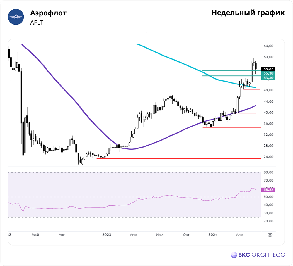 Мнение: БКС Мир Инвестиций. Аэрофлот. Откат после выполнения целей роста. На предыдущей торговой сессии акции Аэрофлота выросли на 1,34%. Цена на закрытии составила 55,82 руб. Акции торговались лучше рынка. Объем торгов составил 2 млрд руб. Краткосрочная картина • В середине прошлой недели акции сделали еще рывок наверх, но без достижения локальных целей роста 59,9–60,16. Максимум установлен на отметке 59,59. Затем цена пробила трейлинг-стоп дневного графика 56,74. Указывалось, что при его сломе появятся риски для окончания роста и начала, как минимум отката. • Техническая картина часового графика на стороне продавцов. Структура на дневном графике еще формируется. Сейчас реализовался первый импульс падения. Первая волна закончится, при пробое сопротивления 56,45 с текущих уровней. • На дневном графике кривая RSI на отметке 61 п. На 4-часовом графике акции между 50- и 200-дневной скользящей средней. В первую очередь следим за уровнями сопротивления и поддержки: 56,45 и 53,9. Внешний фон Внешний фон с утра нейтральный. Фьючерс на индекс S&P 500 падает на 0,3%. Индексы АТР торгуются разнонаправленно. Нефть Brent в минусе 0,2%. Уровни сопротивления: 56,45 / 59,59 / 65,5 Уровни поддержки: 53,9 / 48,4 / 39,52 Долгосрочная картина • Новая сформированная структура месячного и недельного графика указывает на первые цели роста 53,3–55,3 (выполнены). • Текущие цели движения цены смотрим в краткосрочной картине. • В долгосрочной картине нужно смотреть на закрытие недельной свечи под конец торгов пятницы. Автор: Андрей Мамонтов. [Не является индивидуальной инвестиционной рекомендацией]