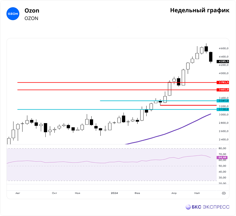 Мнение: БКС Мир Инвестиций. Ozon. Идет долгожданная коррекция. ГДР Ozon на прошлой торговой сессии упали на 3,15%. Цена на закрытии составила 4285,5 руб. Бумаги торговались хуже рынка. Объем торгов составил 1,4 млрд руб. Краткосрочная картина: - В течение недели начала реализовываться коррекция. Локальный минимум установлен на отметке 4241. Более оптимально увидеть снижение в сторону области 3600–3783, но все будет зависеть от структуры, цена может не коснуться этой зоны. Потенциальные цели падения будут указаны при формировании структуры на дневном графике. Сейчас формируется первая волна. - Техническая картина часового графика на стороне продавцов. Для продолжения падения с текущих нужен проход минимума 4241. Первая волна будет готова при пробое вверх 4528,5 с текущих цен. - На дневном графике кривая RSI на отметке 51 п. На 4-часовом графике котировки между 50- и 200-дневных скользящих средних. В первую очередь следим за уровнями сопротивления и поддержки: 4528,5 и 4241. Внешний фон. Внешний фон с утра нейтральный. Фьючерс на индекс S&P 500 падает на 0,1%. Индексы АТР торгуются в зеленой зоне. Нефть Brent в минусе на 0,2%. Уровни сопротивления: 4528,5 / 4725,5 / 4800 Уровни поддержки: 4241 / 3987 / 3221,5 Долгосрочная картина: - Ранее недельная свеча закрепилась выше отметки 3783,5. Ускорение роста и цели cформируются после текущей коррекции. Локальные цели движения смотрим в краткосрочной картине. - В долгосрочной картине нужно смотреть на закрытие недельной свечи под конец торгов пятницы. - Ozon - вторая по величине площадка электронной коммерции в России после Wildberries. С 2016 г. компания поднялась в рейтинге на 6 позиций благодаря росту числа заказов и, как следствие, объемам продаж. Автор: Андрей мамонтов. [Не является индивидуальной инвестиционной рекомендацией]
