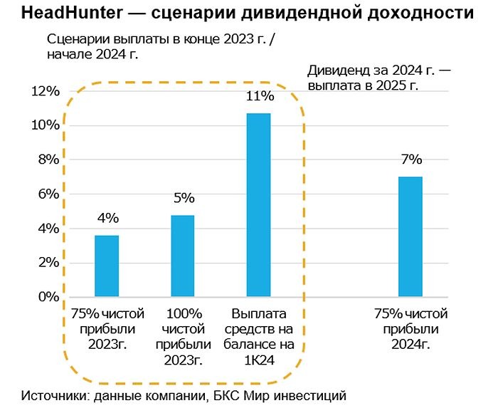 Мнение: БКС Мир Инвестиций. HeadHunter. Снижаем целевую цену. Сохраняем «Позитивный» взгляд, хотя понижаем целевую цену по бумагам HeadHunter на 4%, до 6600 руб. за расписку. Аналитики БКС учли планируемое повышение ставки налога на прибыль с 2025 г. и в результате снизили целевые цены по сектору в среднем на 8%. HeadHunter - быстрорастущая высокоприбыльная компания, которая выигрывает от конкуренции за персонал в РФ, и от которой ждем возобновления дивидендов после редомициляции. Взгляд на компанию. Сильные ожидания на 2024 г., смена «прописки». Повышение конкуренции за персонал в РФ стало ключевым драйвером финансовых результатов за 2023 г. Ждем продолжения быстрого роста и в 2024 г. Компания находится в процессе переезда в РФ, что временно может негативно сказаться на котировках, но улучшает дивидендные перспективы. Драйверы роста: - Рост реального ВВП и конкуренция за рабочую силу. В I квартале 2024 г. выручка HeadHunter сохранила высокие темпы роста, прибавив 55% год к году (г/г) против 63% в 2023 г. Поддержку оказала клиентская активность: число платящих клиентов выросло на 18%, выручка на клиента — на 32%. Хотя на фоне нормализации базы сравнения темп выручки стал замедляться, по-прежнему сильная конкуренция за персонал, на наш взгляд, позволит компании активно расти. Безработица в РФ в I квартале 2024 г. упала до 2,8%, индекс конкуренции на рынке труда от HeadHunter указывал на дефицит персонала, а экономика продолжила расти: реальный ВВП в I квартале 2024 г. прибавил 5,4% г/г, по оценке Росстата. В этих условиях число вакансий на hh.ru в указанный период выросло на 31% г/г, и на середину мая такая сильная динамика сохранялась. В свете этих факторов повышаем прогноз выручки по итогам 2024 г. — ждем рост на 40%. - Обмен бумаг в депозитариях РФ летом. Компания находится в процессе редомициляции в РФ с Кипра. Первый этап включал обмен расписок HeadHunter Group PLC на акции МКАО «Хэдхантер» для держателей в зарубежной биржевой инфраструктуре и завершился в марте. Далее компания планирует предложить аналогичный обмен держателям в российских депозитариях и провести листинг акций МКАО (в будущем МКПАО) на Мосбирже. Компания полагает, что торги акциями МКАО начнутся в III квартале 2024 г., поэтому ждем предложения об обмене бумаг в российских депозитариях этим летом. - Возврат к дивидендам может поддержать бумаги при коррекции. Ждем, что «переезд» снимет препятствия для дивидендов и компания вернется к выплатам. При распределении 75–100% скорректированной чистой прибыли за 2023 г. дивдоходность могла бы составить 4–5%, а в случае выплаты всех денежных средств на I квартал 2024 г., что возможно, учитывая высокую рентабельность бизнеса, — 11%. На горизонте 12 месяцев не исключаем регулярных дивидендов с выплатами за 2024 г. с дивдоходностью 7%. Компания может совместить обе выплаты — в этом случае ждем общей дивдоходности не менее 11%. Ключевые риски: - Макроэкономика, регулирование, конкуренция. - Редомициляция — временное давление на котировки. Краткосрочно после редомициляции на расписки может давить «навес» бумаг: акционеры в зарубежном периметре, возможно, будут готовы продать бумаги по более низким ценам, чем текущие держатели в российской юрисдикции. Но считаем, что сильные прогнозы на 2024 г. и возврат дивидендов могут поддержать котировки при коррекции. Основные изменения. Налог на прибыль. Минфин предложил повысить нал