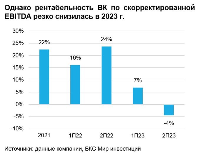 Мнение: БКС Мир Инвестиций. ВК. Снижаем целевую цену. Понижаем целевую цену акции ВК, ведущей технологической компании в РФ, на 8% — до 540 руб. Также подтверждаем «Негативный» взгляд на бумагу. Сохраняем «Негативный» взгляд на ВК — хороший рост выручки и аудитории, но при резком увеличении расходов, экономическую выгоду которых еще предстоит продемонстрировать. Аналитики учли планируемое повышение ставки налога на прибыль с 2025 г. и в результате снизили целевые цены по сектору в среднем на 8%. Взгляд на компанию. Потенциал для выручки, но слабая рентабельность. ВК остается в числе игроков, которые выигрывают от тренда на цифровизацию и снижения конкуренции на рынке рекламы в РФ c 2022 г. ВК продолжает укрепляться в сегменте соцсетей и медиаконтента, который принес компании 64% выручки в 2023 г. По данным Mediascope на декабрь 2023 г., с прошлого года среднесуточная аудитория ВКонтакте выросла на 4%, до 55 млн, а среднемесяная — на 4%, до 89 млн. Несмотря на рост выручки на 36%, из-за увеличения инвестиций EBITDA в 2023 г. упала на 98% год к году (г/г). Насколько рентабельным будет бизнес в дальнейшем зависит от решения менеджмента. Полагаем, что рентабельность в 2024 г. останется слабой. Напомним, ВК не платит дивиденды. Драйверы роста: Рост доли на рынке рекламы РФ. В 2023 г. выручка ВК от рекламы увеличилась на 40%. Драйверами стали: повышение реального ВВП, изменение конкурентного ландшафта c 2022 г. и консолидация «Дзен». Ожидаем, что снижение конкуренции поддержит рост выручки от рекламы и в 2024 г., но его влияние со временем снизится. Дальнейшие перспективы во многом зависят от того, будут ли введены дополнительные ограничения на зарубежные сервисы. Новые возможности в определенных нишах. Благодаря ослаблению конкуренции со стороны иностранных сервисов неплохой потенциал у магазина приложений RuStore, появляются возможности в сегменте сервисов для бизнеса, в том числе облачных, и перспективы выгодных приобретений. Возможное IPO Skillbox. Первичное размещение акций образовательного сервиса Skillbox возможно в 2024 г., по данным РБК, и могло бы подержать котировки. Для ВК это относительно небольшой сегмент — 12% выручки в 2023 г., поэтому эффект зависел бы от оценки. Ключевые риски: Слабая рентабельность в 2024 г. Полагаем, что неопределенность в части расходов сохранится в 2024 г., в том числе из-за конкуренции. Хотя в соцсетях она снизилась с 2022 г., ВК борется за внимание пользователей и с YouTube, и с Telegram. Их аудитория росла быстрее ВКонтакте: +8–21% г/г против +4% в декабре 2023 г., по данным Mediascope. А с июля 2023 г. Telegram опередил ВКонтакте по дневной аудитории. Макроэкономика и регулирование остаются в числе потенциальных источников риска, в частности для основного для ВК сегмента — рекламы. Основные изменения. Налог на прибыль. Минфин предложил повысить налог на прибыль до 25% с 20% с начала 2025 г. Считаем очень высокой вероятность утверждения предложения, снижаем целевую цену, но подтверждаем взгляд. Взгляд: «Негативный». Целевая цена на 12 месяцев — 540 руб. Понижаем целевую цену акции ВК, ведущей технологической компании в РФ, на 8%, до 540 руб., и подтверждаем «Негативный» взгляд на бумагу. ВК — хороший рост выручки и аудитории, но при резком увеличении расходов, экономическую выгоду которых еще предстоит продемонстрировать. Аналитики учли планируемое повышение ставки налога на прибыль с 2025 г. и в результате 