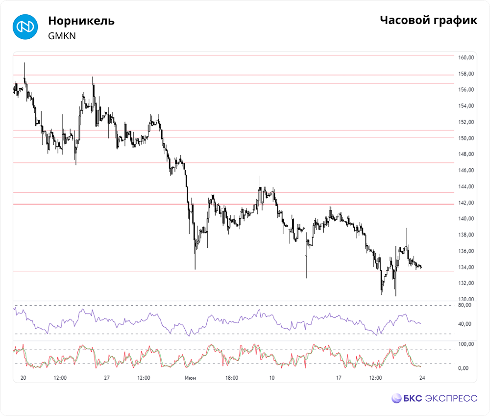 Мнение: БКС Мир Инвестиций. ГМК Норильский никель. Восстановление прервано. На предыдущей торговой сессии акции Норникеля снизились на 1,7%, закрытие прошло на отметке 134 руб. Бумага выглядела хуже рынка, потерявшего 0,46%. Краткосрочная картина: - На торговой сессии пятницы двухдневный отскок акций Норникеля завершился, на откате бумаги вернулись в район актуальной ранее поддержки 133,5 руб. Из интересного — котировки полностью проигнорировали взлет палладия на торгах пятницы. - Краткосрочные ожидания осторожные. Если в ближайшие сессии удастся удержаться выше 133,5 руб., можно будет рассчитывать на отскок выше 136 руб. Такой сценарий поддерживает перепроданный стохастик на часовике. - В то же время уверенности в полноценной активизации покупателей сейчас нет — падающий тренд с середины мая остается актуальным. Прокол тренда возможен, но сильных драйверов к началу роста не наблюдается. - При пробое 133,5 руб. целью снижения выступит локальное дно на 130,5 руб. Внешний фон. Азиатские рынки торгуются преимущественно на отрицательной территории. Фьючерс на индекс S&P 500 снижается на 0,1%, нефть Brent в плюсе на 0,1% и находится около $85,2. Уровни сопротивления: 142 / 143 / 157 Уровни поддержки: 133,5 / 130,5 / 120 Долгосрочная картина: - В 2021 г. стартовала коррекция от исторических вершин, которая переросла в двухлетний падающий тренд. От максимумов к текущему моменту котировки потеряли более 50%. - С конца 2022 г. акции Норникеля находились в боковике, отражая ухудшение конъюнктуры на рынках ключевых металлов, снижение дивидендов. Нижней границей консолидации выступал уровень 142 руб., который в июне 2024 г. был пробит. - Локально акции выглядят перепроданными, стохастик на недельном интервале перегрет. При этом драйверов для начала растущей тенденции пока не просматривается. Акции находится под давлением роста издержек и процентных расходов, высокой инвестпрограммы, а также отказа от выплаты дивидендов за 2024 г. [Не является индивидуальной инвестиционной рекомендацией]