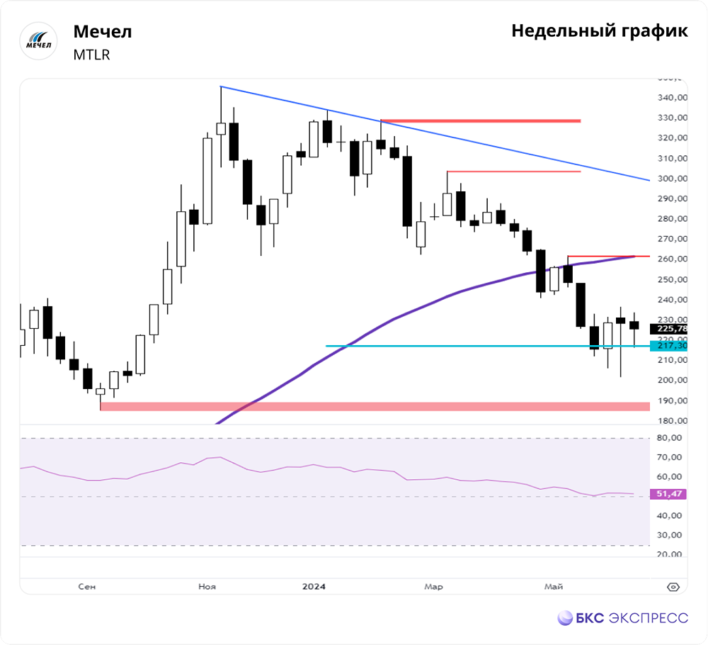 Мнение: БКС Мир Инвестиций. Мечел. Появилась структура на рост. Акции компании Мечел на прошлой торговой сессии выросли на 3,61%. Цена на закрытии составила 225,78 руб. Бумаги торговались лучше рынка. Объем торгов составил 1,41 млрд руб. Краткосрочная картина: - В четверг на дневном графике сформировалась структура роста со следующими целями: 1) 242–244,69, 2) 254,7–258,4. Пока нет слома поддержки 201,9, этот сценарий в приоритете. При сломе 216,59 цели роста будут пересчитаны в сторону повышения. - Техническая картина часового графика на стороне покупателей. Сегодня допускается локальное движение в зону 226,5–229,8. Таким образом покупатели будут тестировать зону сопротивления 233,96–236,69. Допускается, что пробить ее с первого раза не получится и возможем боковик 217–229 в течение недели. - На дневном графике кривая RSI на отметке 41 п. На 4-часовом графике акции между 50- и 200-дневных скользящих средних. В первую очередь следим за уровнями сопротивления и поддержки: 236,69 и 201,9. Уровни сопротивления: 233,96 / 236,69 / 262,26 Уровни поддержки: 216,59 / 201,9 / 185,5 Долгосрочная картина: - На недельном графике новые структуры движения не появились. Текущий ориентир для цены — отскок в сторону рубежа 262,26. Локальные цели движения смотрим в краткосрочной картине. - Ранее на недельном графике структура падения указывала на цели: 1) 240,2–246,6 (достигнуты), 2) 217,3–228,2 (достигнуты). - В долгосрочной картине нужно смотреть на закрытие недельной свечи под конец торгов пятницы. Автор: Андрей Мамонтов. [Не является индивидуальной инвестиционной рекомендацией]