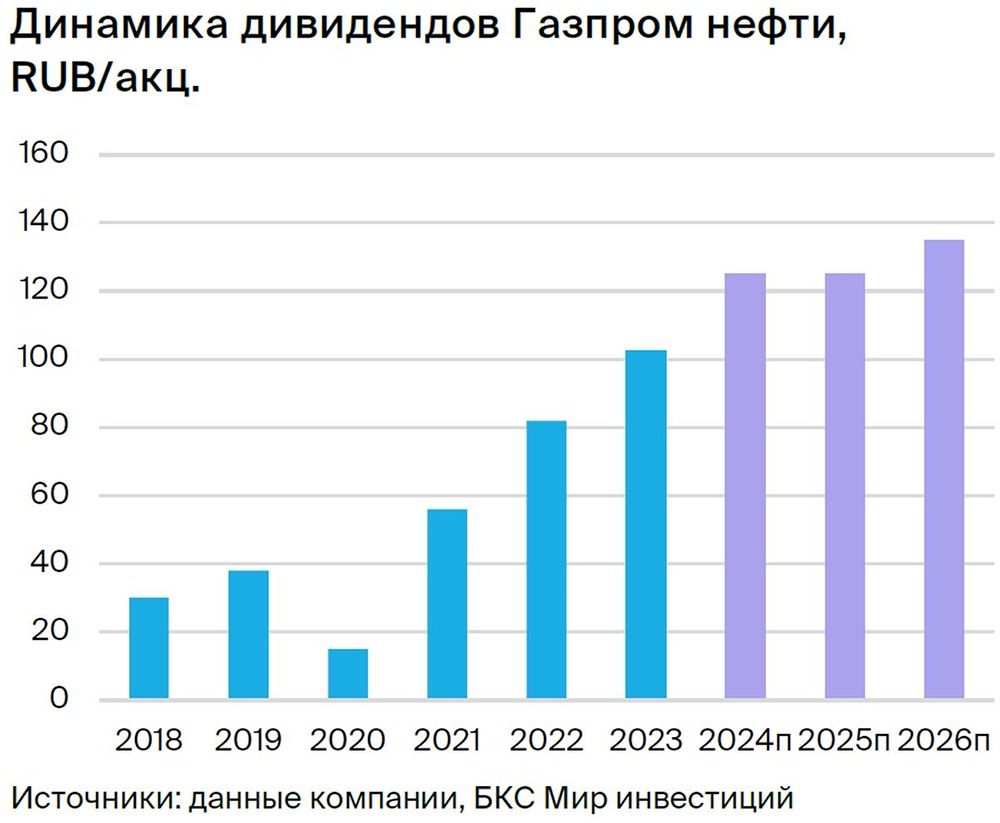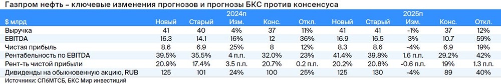 Мнение: БКС Мир Инвестиций. Газпром нефть: мощный потенциал роста. В квартальной стратегии аналитики БКС поделились своими ожиданиями от рынка на ближайшие три месяца и представляют глобальный прогноз по отдельным секторам и эмитентам. Целевая цена акции представителя нефтегазового сектора Газпром нефти на горизонте года — 1000 руб., взгляд на бумагу «Позитивный». В этой публикации рассказываем, что ждет компанию в III квартале 2024 г. Мы сохраняем целевую цену акций Газпром нефти на уровне 1000 руб. за бумагу и подтверждаем «Позитивный» взгляд. Новая дивидендная политика — 75% чистой прибыли — не до конца заложена в прогнозы рынка, и мы ждем дивдоходность 17,1% за 2024 г. (крупнейшая в отрасли). Бумага торгуется с мультипликатором P/E 4,5x 2024п, на 1% выше исторического среднего. Взгляд на компанию Рост добычи конденсата, повышение дивидендов недооценено, сильный баланс. Прибыль нефтяного сектора сильно превосходит уровни 2015–2021 гг. Газпром нефть увеличила уровень дивидендных выплат с 50% до 75% чистой прибыли, чтобы помочь материнской компании — Газпрому. И этот факт не до конца учтен в прогнозах рынка, которые закладывают 65%. Недавно компания начала добычу мокрого газа участке 3А ачимовских залежей Уренгойского месторождения. Новый проект добавит Газпром нефти 5 млрд куб. м газа и 1,5 млн т конденсата в год (33 тыс. баррелей в сутки), что увеличит добычу жидких углеводородов компании на 3%. Чистый долг компании в 2023 г. составил $3,4 млрд, а соотношение Чистый долг/EBITDA — всего 0,2х. Драйверы роста • Мощный потенциал роста Газпром нефти завязан на ее проекты (проект «Зима», нефтяные оторочки гигантских и сверхгигантских газовых месторождений Газпрома). Сейчас менеджмент сосредоточился на росте добычи конденсата, который не ограничен сделкой ОПЕК+. • Рост уровня дивидендных выплат до 75%. Чтобы помочь материнской компании с денежными средствами, Газпром нефть подняла коэффициент выплат до 75% чистой прибыли за 2023 г. с минимума в 50%. Мы считаем, что 75% станут новой нормой, но рынок все еще ожидает уровень в 65%. Ключевые риски Рост рыночного риска (беты). Корреляция акций Газпром нефти с рынком долгое время была низкой, что добавляло ценности растущим дивидендам. Но бета-коэффициент бумаги постепенно растет и теперь приближается к рыночному показателю 1,0. Наряду с увеличением безрисковой ставки это позволяет повысить стоимость акционерного капитала на 140 б.п. Основные изменения Улучшаем оценку прибыли и дивидендов. Мы не меняли прогноз на 2024 г., включая дивиденды в размере 125 руб. на акцию, исходя из выплаты 75% чистой прибыли. Немного снизили оценки чистой прибыли и дивидендов на 2025 г. (ждем роста налога на прибыль). Консенсус по EBITDA на 2024–2025 гг. выглядит консервативно. Возможно, дело в разнице макропрогнозов, но еще и в том, что рынок закладывает уровень выплат в 65%. Взгляд: «Позитивный». Целевая цена на 12 месяцев — 1000 руб. Сохраняем целевую цену 1000 руб. на акцию и «Позитивный» взгляд с избыточной доходностью 20%. Акции Газпром нефти торгуются с мультипликатором P/E 4,3x 2024п, с премией 2% к историческому среднему. Дивдоходность за 2024 г. ожидаем в размере 17,7% — крупнейшая в отрасли. [Не является индивидуальной инвестиционной рекомендацией]