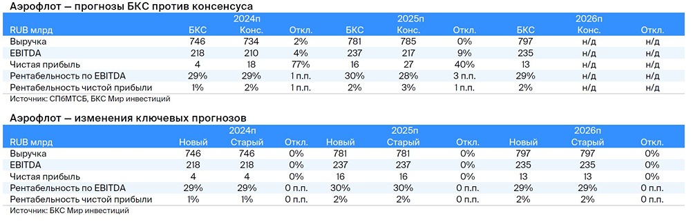 Мнение: БКС Мир Инвестиций. Аэрофлот: бизнес компании восстанавливается. В квартальной стратегии аналитики БКС поделились своими ожиданиями от рынка на ближайшие три месяца и представляют глобальный прогноз по отдельным секторам и эмитентам. Целевая цена акции представителя транспортного сектора Аэрофлота на горизонте года — 47 руб., взгляд на бумагу «Негативный». В этой публикации рассказываем, что ждет компанию в III квартале 2024 г. Сохраняем «Негативный» взгляд на акции Аэрофлота, новая целевая цена — 47 руб. за бумагу. Аэрофлот опубликовал в целом хорошие цифры за I квартал 2024 г. по МСФО: скорректированная EBITDA за квартал составила 59 млрд руб. Также отмечаем небольшую прибыль в размере 0,6 млрд руб. с нашими корректировками. По нашим расчетам, средний чек в I квартале 2024 г. составил 5,08 руб. за пассажиро-километр (пкм), чуть снизившись с 5,1 за пкм в IV квартале 2023 г. Теперь важно понять дальнейший тренд по ставке. Сильный I квартал 2024 г. дает шанс на прибыль по итогам 2024 г. Взгляд на компанию Аэрофлот — национальный перевозчик. В целом компания показывает улучшение финансового состояния. Пока предполагаем среднюю ставку 5,2 руб. за пкм в среднем по году. Если, предположим, ставка не будет расти во II – IV кварталах 2024 г., можем увидеть небольшое сжатие маржи. Стоит отметить работу с издержками по ряду статей и давление со стороны технического обслуживания и топлива (оба растут). По сути, возможность Аэрофлота удерживать и наращивать уровень среднего чека — это залог выхода компании на положительные значения по чистой прибыли за 2024 г. Драйверы роста Рост спроса = рост потока и оборота = поддержка для цен. Аэрофлот продолжает радовать хорошей операционной статистикой по пассажирам и пассажирообороту — последняя за май 2024 г. Так, пассажирооборот группы вырос на 27% год к году (г/г). Однако ключевой фактор для роста маржинальности — средний билет. Считаем, что резкого роста маржинальности (стоимости среднего билета) сейчас, пожалуй, не стоит ждать. Причина заключается во внимании ФАС к внутренним ценам на авиабилеты. Недавно была встреча руководства Аэрофлота с представителями ФАС, где в частности обсуждалось ценообразование. Ключевые риски Технические проблемы, геополитика, спрос и цены. Небольшая скорректированная прибыль в I квартале 2024 г. знаменует хорошее начало года, поскольку исторически компания показывала убыток в сезонно слабом I квартале. Однако обращаем внимание на ряд факторов неопределенности: санкции, будущее ставок, геополитика. На этом фоне и с учетом наших прогнозов у нас сохраняется «Негативный» взгляд на Аэрофлот с целевой ценой 47 руб. за акцию. Основные изменения Меняем стоимость капитала, ставку роста в постпрогнозный период. Считаем, что бизнес Аэрофлота восстанавливается, и прогноз становится более позитивным. Взгляд: «Негативный». Целевая цена на 12 месяцев — 47 руб. Целевая цена «Негативный» взгляд. Оцениваем Аэрофлот по методу дисконтирования денежных потоков: средневзвешенная стоимость акционерного капитала — 20,1%, стоимость акционерного капитала — 22,3%, темпы роста в постпрогнозный период — 4%. Отмечаем хорошие скорректированные результаты за I квартал 2024 г., но считаем, что у компании есть ряд вызовов, в частности, санкции против Победы, поддержание флота в работоспособном состоянии и прочие сложности. [Не является