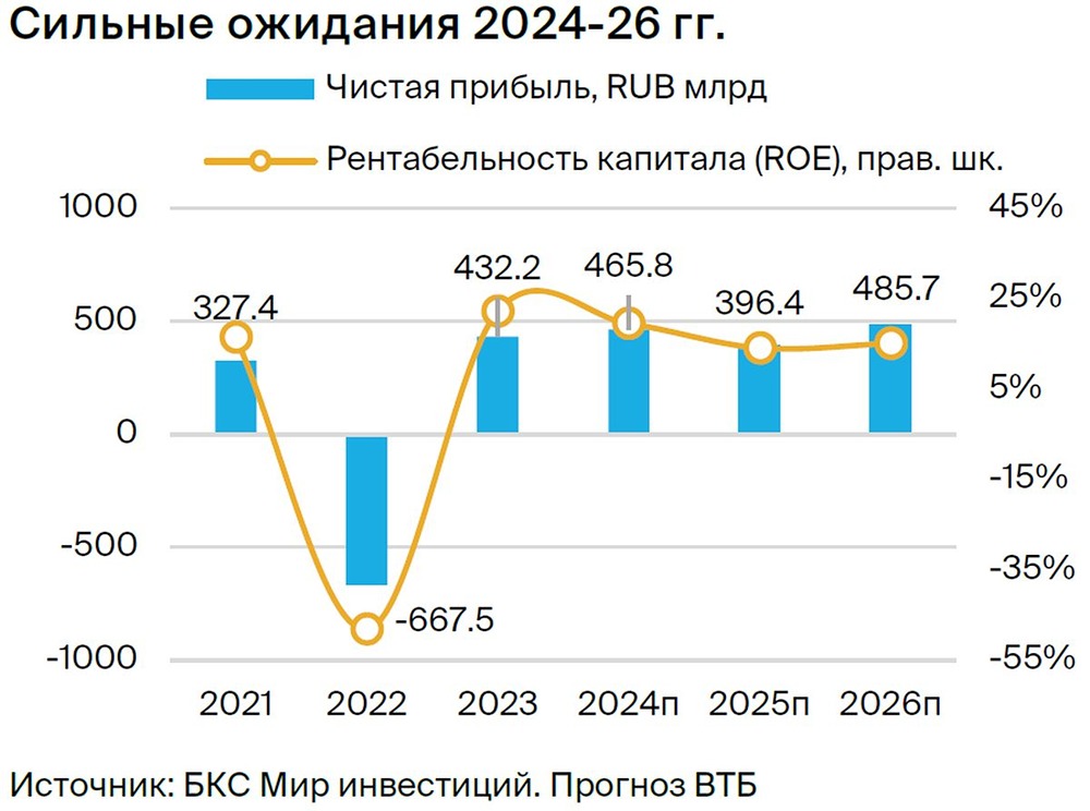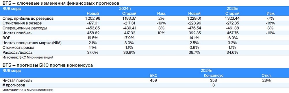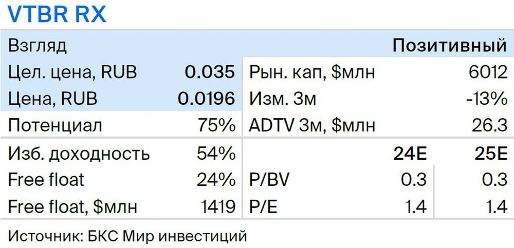 Мнение: БКС Мир Инвестиций. ВТБ: в акциях виден потенциал роста. В квартальной стратегии аналитики БКС поделились своими ожиданиями от рынка на ближайшие три месяца и представляют глобальный прогноз по отдельным секторам и эмитентам. Целевая цена акции представителя финансового сектора ВТБ на горизонте года — 0,035 руб., взгляд на бумагу «Позитивный». В этой публикации рассказываем, что ждет компанию в III квартале 2024 г. Мы подтверждаем «Позитивный» взгляд по бумагам ВТБ, но понижаем целевую цену до 0,035 руб. из-за роста стоимости капитала и давления повышенных процентных ставок на маржу. При этом сильная динамика прибыли ВТБ и потенциальный возврат к дивидендам все еще не учтены в оценке. Взгляд на компанию. Второй крупнейший банк в РФ, фокус на розницу. ВТБ занимает второе место в России, уступая лишь Сберу. В своей стратегии ВТБ ставит на активное масштабирование розничного бизнеса (услуги для физических лиц) с экспансией в регионы. У ВТБ высокие финансовые цели на 2024–2026 гг. Менеджмент закладывает в модель рост чистой прибыли до 650 млрд руб. к 2026 г. с рентабельностью 20%. Ставка на розницу поддержит рентабельность бизнеса. Банк находится под санкциями, что несет средние риски для бизнес-модели. Драйверы роста. «Дивидендный сюрприз» — возврат к дивидендам за 2024 г. Текущий фокус ВТБ — укрепление капитала, поэтому банк планирует направлять прибыль в капитал в ближайшие три года и достигнуть к 2026 г. норматива Н20.0 в 10,9%. ВТБ учитывает ужесточение регуляторных требований с минимальным Н20.0 9,5% к 2026 г. и 11,5% к 2028 г. против 8% в 2023 г. Укрепление капитальной базы позволит увеличить запас капитала против регуляторных минимумов и вернуться к выплате дивидендов. По модели ВТБ, выплаты по итогам 2025 г. могут составить 80 млрд руб. CEO недавно допустил возврат к дивидендам за 2024 г., что могло бы стать позитивным сюрпризом, но мы не закладываем его в текущую модель. Ключевые риски. Макрориски, капитал. Более слабая, чем ожидалось, макроконъюнктура может повлиять на финансовые результаты ВТБ и реализацию Стратегии – 2024–2026, препятствовать росту кредитования и представлять риски для качества активов. Кроме того, банк активно укрепляет капитальную базу, на что может оказывать влияние рост рисков и регулирование. Основные изменения. Выше ожиданий на 2024 г. — потенциал повышения прогнозов. Мы обновили наши прогнозы финансовых результатов ВТБ с учетом недавних финансовых релизов и заявлений менеджмента о поддержке финансового результата 2024 г. за счет работы с заблокированными активами. Текущий ориентир по прибыли в 2024 г. — 435 млрд руб. — может быть повышен, и мы отчасти заложили данный позитив в модель. Но также мы отразили рост налогов и сохранение повышенных процентных ставок в соответствии с новым макропрогнозом, что повлияло на ожидания на 2025 г. Взгляд: «Позитивный». Целевая цена на 12 месяцев — 0,035 руб. Взгляд «Позитивный», целевая цена скорректирована. Для оценки ВТБ мы используем модель роста Гордона с безрисковой ставкой 14,5% (12% ранее) и снизили премию за риск до 7% с 8,5% на фоне рыночных трендов. Финансовые прогнозы изменились, а стоимость капитала повысилась: мы скорректировали целевую цену, но по-прежнему видим высокий потенциал роста в акциях из-за ожиданий солидной прибыли. [Не является индивидуальной инвестиционной рекомендацией]