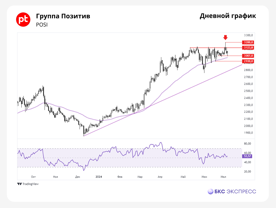 Мнение: БКС Мир Инвестиций. Группа Позитив: неуверенно обновили максимумы. В пятницу акции Группы Позитив подросли на 0,7%. Цена закрытия — 3071 руб. Объем торгов 0,51 млрд руб. — пониженный. Краткосрочная картина • В пятницу бумаги Группы Позитив выросли чуть сильнее рынка, при этом подъем котировок сопровождался пониженными торговыми оборотами. • Стоит отметить немного нетипичную динамику котировок в пятницу. Примечательно то, что основной прирост пришелся на часы перед закрытием основной сессии, а затем продолжился умеренными темпами на вечерней. Последнее слово осталось за покупателями. • На минувшей неделе был переписан исторический максимум, однако удержаться на 3200 руб. не получилось, акции перешли к откату. Поддержка вновь была найдена на уровне 3007 руб., который уже неоднократно тестировался за последние две недели. • На текущей неделе можем уйти в проторговку. В качестве верхней границы можно выделить уровень 3123 руб., где, вероятно, будут активно включаться продавцы, ранее помешавшие закрепиться на новом максимуме. Нижней границей выступит уровень на 3007 руб. Однако может состояться прорыв указанного диапазона, в случае если широкий рынок начнет развивать резкое движение в какую-либо сторону. Внешний фон В пятницу индекс S&P 500 вырос на 0,55%. Фьючерс на индекс утром держится около нуля. Азиатские индексы снижаются: Китай теряет 0,3%, Япония 0,1%. Нефть Brent в пятницу подешевела на 0,6%, с утра теряет еще столько же. Уровни сопротивления: 3123 / 3200 / 3360 Уровни поддержки: 3007 / 2930 / 2760 Долгосрочная картина • В качестве поддержки на текущем тренде хорошо отыгрывается 50-дневная скользящая. По ходу всего года бумага торгуется существенно выше нее, однако в последнее время эта дистанция сократилась. При более масштабном откате зоной для пит-стопа может послужить область поддержки на 2930 руб., недалеко от которой проходит восходящая трендовая. • Неудавшаяся попытка закрепиться выше отметки в 3124 руб. при обновлении исторического максимума выглядит несколько настораживающе. Подобная неуверенная динамика цен может спровоцировать череду распродаж со стороны держателей, что может перерасти в откат. При этом покупка по текущим уровням выглядит уже достаточно дорогой. • Группа Позитив планирует провести допэмиссию акций в размере 7,9% в IV квартале 2024 г. Акции будут поступать в рынок постепенно. Это умеренно-негативный фактор для котировок в более отдаленной перспективе при текущем количестве 20% акций в свободном обращении. • Взгляд аналитиков БКС на бумагу «Негативный». Прогнозная цена на горизонте 12 месяцев составляет 2400 руб. (-21,85% от текущих). Автор: Олег Решетников. [Не является индивидуальной инвестиционной рекомендацией]