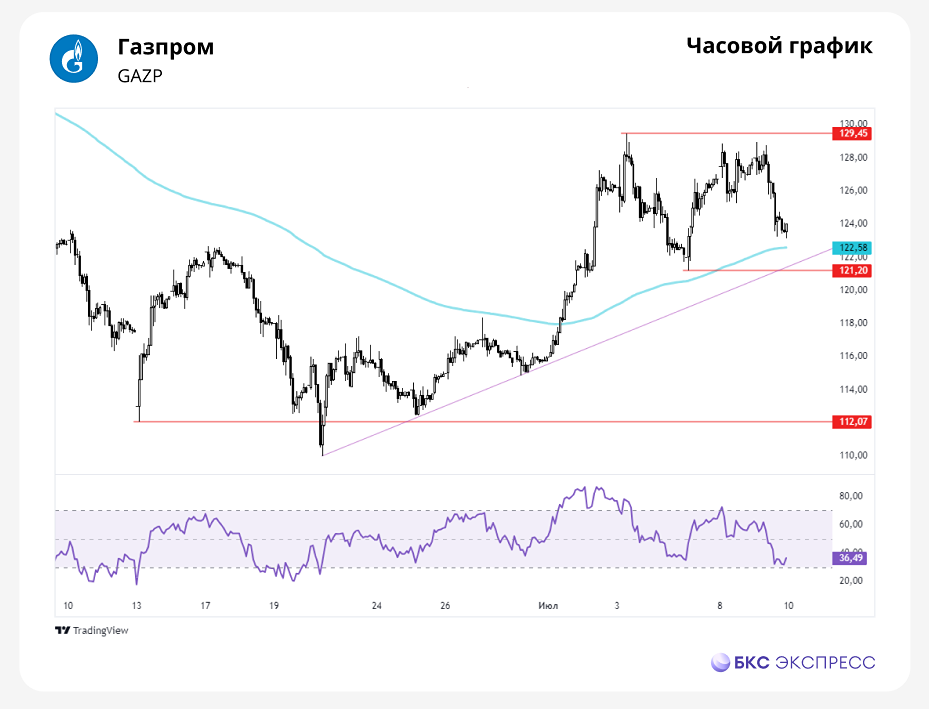 Мнение: БКС Мир Инвестиций. Газпром: падаем на фоне дивидендных отсечек. Во вторник акции Газпрома упали в цене на 2,89%, до 124,05 руб. Объем торгов составил 11,4 млрд руб. — повышенный. Краткосрочная картина • Во вторник котировки Газпрома снижались на повышенных торговых оборотах вместе с рынком. Крупные компании постепенно «очищаются» от дивидендов, что приводит к падению котировок и, как следствие, к спаду индекса МосБиржи. Рынок может пребывать в состоянии повышенного давления до конца недели, поскольку еще предстоит пройти ряд крупных отсечек. • Дополнительном негативом для акций Газпрома послужила новость о том, что Австрия создала комиссию для изучения возможностей разрыва контракта с газовым гигантом. Учитывая, что Газпром снизился наравне с рынком, можно предположить, что крупного резонанса новость не вызвала. • Учитывая умеренную амплитуду коррекции акций газового гиганта в рамках общего спада на рынке, поводов для беспокойства пока не видно. Акции перепроданы и, вероятно, продолжат постепенно восстанавливаться вскоре после того, как крупные отсечки прекратятся. • Ближайшая зона сопротивления на 128,2–129,4 руб. и поддержка на 121,2 руб. остаются актуальными. Дополнительной поддержкой может являться 200-часовая скользящая, которая сейчас находится на 122,5 руб. Внешний фон Во вторник индекс S&P500 вырос на 0,07%. Фьючерс на индекс с утра колеблется около нуля. Динамика азиатских индексов разнится: Китай стоит на месте, Япония растет на 0,2%. Вчера Brent подешевела на 0,87%, с утра теряет дополнительные 0,6%. Уровни сопротивления: 129,5 / 142,2 / 150,6 Уровни поддержки: 121,2 / 112,1 / 110 Долгосрочная картина • С конца апреля акции Газпрома в пике теряли около 35%, а также существенно отклонились вниз от 200-дневной скользящей. С фундаментальной точки зрения это обусловлено тем, что экспортная газопроводная монополия впервые за 25 лет зафиксировала годовой чистый убыток и отказалась от выплаты дивидендов за 2023 г. • За счет роста предыдущей недели на более 9% снята сильная перепроданность на дневном графике по RSI. Запас для роста имеется, последние дни значение индикатора консолидируется вблизи 50. • Довольно прочная поддержка была найдена на уровне вблизи отметки 110 руб., послужившей фундаментом для формирования дна. Глобально бумаги торгуются около семилетних минимумов. • Взгляд аналитиков БКС на бумагу «Нейтральный», целевая цена на горизонте года составляет 150 руб., что предполагает рост котировок на 20,92% с текущих. Автор: Олег Решетников. [Не является индивидуальной инвестиционной рекомендацией]