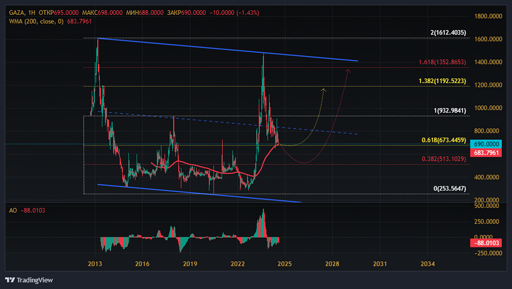 Акция: ГАЗ Тикер: GAZA ТФ: 1Н [неделя] Долгосрочная техническая картина по акции с двумя возможными сценариями. Причина 2х сценарием кроется в том, что акция остановилась на 200-недельной скользящей и имеет право начать отскок и сформировать ростовую модель. А второй негативный красный сценарий "имеет право на жизнь" по причине технического правила: "Актив достигшей импульсным движением 1.618, также стремительно должен вернуться к отметкам в 0.382 по Фибо." Если считаешь, что победят лонгисты - ставь быка под постом, если шортисты - ставь медведя. Автор: MONDIARA_Trading [Не является индивидуальной инвестиционной рекомендацией]