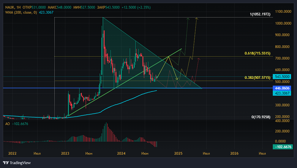 Акция: НПО НАУКА Тикер: NAUK ТФ: 1Н [неделя] 3 варианта изменения котировок по характеру движения. Всё же выход из треугольника и погружение актива ниже 400 рублей на текущей момент менее вероятен, недели чем продолжительная неопределённость по одному из сценариев и начало нового витка роста. Если считаешь, что победят лонгисты - ставь быка под постом, если шортисты - ставь медведя. Автор: MONDIARA_Trading [Не является индивидуальной инвестиционной рекомендацией]