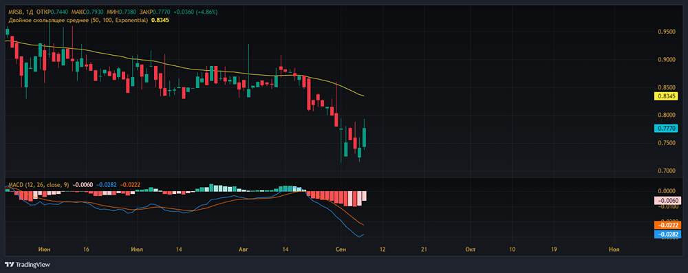 ТФ: 1Д [день] Акция торгуется под 50-ти дневной экспоненциальной средней, касание с которой в будущем окажется первой сильной зоной сопротивления. [Не является индивидуальной инвестиционной рекомендацией]