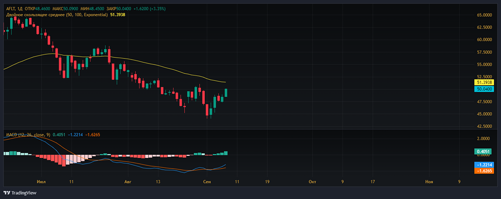 ТФ: 1Д [день] Акция торгуется под 50-ти дневной экспоненциальной средней, касание с которой в будущем окажется первой сильной зоной сопротивления. [Не является индивидуальной инвестиционной рекомендацией]