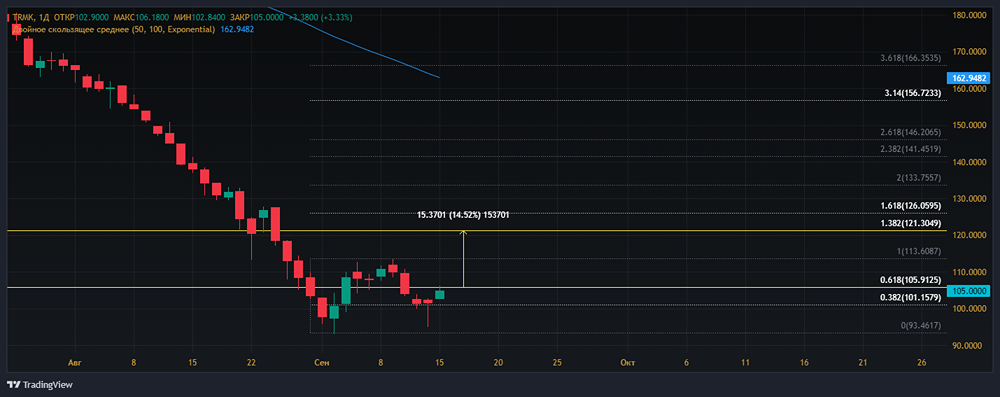 ТФ: 1Д [день] Важная задача у актива выйти выше 106 фигуры и проторговаться. В этом случае первая локальная цель у атива откроется в районе 121 этажа, не выше 126. [Не является индивидуальной инвестиционной рекомендацией]