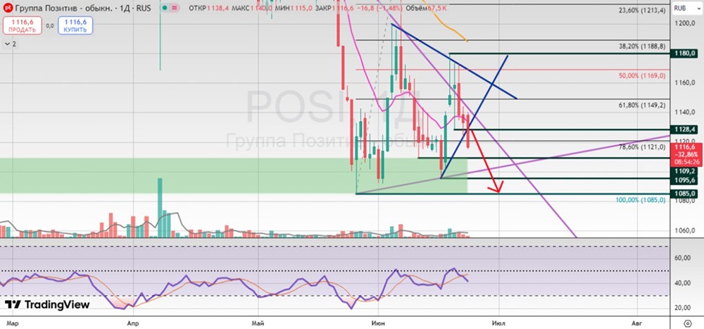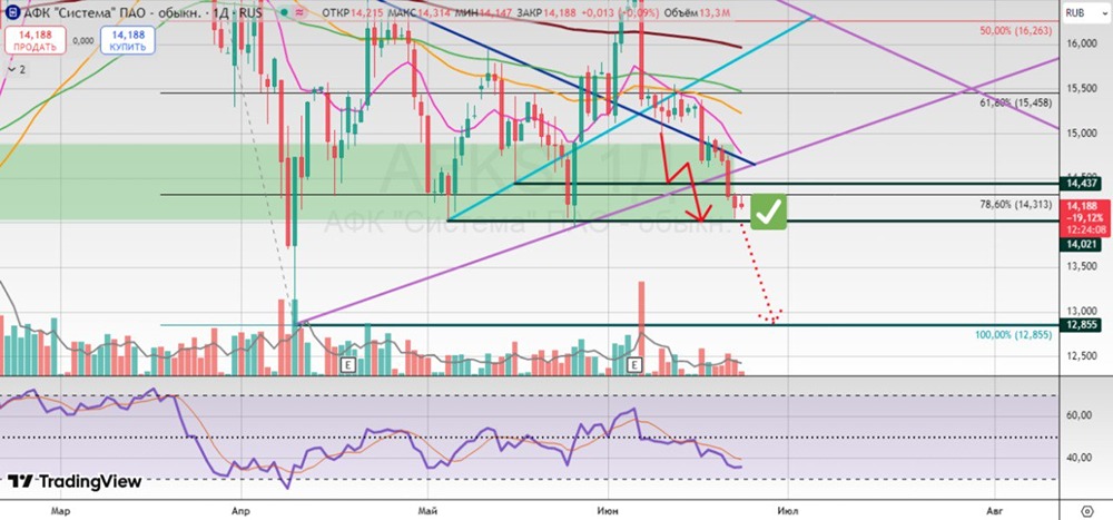 ТФ: 1Д [день] При пробое "линии шеи (3383 фигура)" откроется дорога к 1.618 по Фибо, где произойдет проторговка над 100-дневной скользящей. Данный уровень с технической точки зрения является первым основным уровнем сопротивления, результатом которого будет либо: - проторговка с поддержкой не ниже 3593 фигуры и продолжение роста с целями не выше 3934 этажа; - проторговка и коррекционное движение с целями теста 3383 плоскости с продолжением движения с таргетом в район 3723 вершины; [Не является индивидуальной инвестиционной рекомендацией]