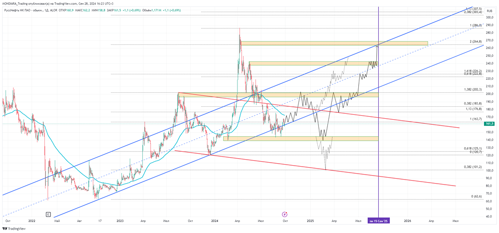 Возможная среднесрочная перспектива. В среднесрочной и долгосрочной перспективе данный актив представляет собой привлекательное инвестиционное решение. Однако, если взглянуть на ситуацию в краткосрочной и среднесрочной перспективе, мы не видим четкой разворотной модели. График скорее указывает на то, что не стоит вкладывать средства, пока не будет найдена надежная основа для более значительного роста. На графике обозначены основные зоны поддержки и сопротивления, а также возможные сценарии развития событий. Если рассмотреть графики с точки зрения графических паттернов, то можно увидеть глобальный паттерн "голова и плечи", который может быть реализован с использованием Фибоначчи, как это показано на графике 1. Обратите внимание, что данный материал не является индивидуальной инвестиционной рекомендацией.