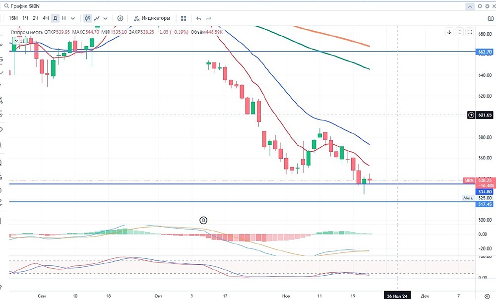 Добрый день уважаемые дамы и господа, инвесторы и трейдеры! 🚨 «Газпром нефть» — вертикально-интегрированная нефтяная компания, основные виды деятельности которой — разведка и разработка месторождений нефти и газа, нефтепереработка, а также производство и сбыт нефтепродуктов. Компания входит в число лидеров российской нефтяной индустрии по эффективности. Крупнейший акционер «Газпром нефти» — ПАО «Газпром». Остальные акции находятся в свободном обращении. По объему добычи углеводородов «Газпром нефть» входит в тройку крупнейших компаний России. ✅Позитив: 📍1. Положительные результаты финансовой деятельности компании, такие как увеличение выручки и чистой прибыли 📍2. Расширение поставок газа в Китай 📍3. Регулярные дивиденды 📍4. Текущая эффективность компании ROE более 20% ⛔Негатив: 📍1. Остановка поставок в Австрию 📢Дополнительно: 🥇1. Чистая прибыль «Газпром нефти» по РСБУ за 9 месяцев 2024 года составила ₽420,05 млрд, увеличившись на 13,7% по сравнению с ₽369,56 млрд в предыдущем году. 🥈2. Выручка выросла на 17,8% до ₽2,84 трлн против ₽2,41 трлн годом ранее. 🥉3. Текущий уровень задолженности 14.83% ниже 100% и уменьшился за 5 лет с 22.08%. 💵Дивиденды: Дивидендная политика Газпром нефти предусматривает целевой размер дивидендных выплат по акциям компании — не менее 50% от чистой прибыли, определяемой в соответствии с МСФО, с учетом корректировок. Дивиденды выплачиваются дважды в год. 💴 - $SIBN : ФА Капитализация - 2988.0 млрд ₽ Кол-во акций ао– 4741.0 млн Кол-во акций ап– 0.0 млн Р/Е - 4.2 P/S - 0.8 P/B - 0.9 ROE - 21.1% EV/EBITDA - 2.3 ⏰ - ТФ 1 DAY 🛠 ТА - скользящие, стохастик, объем, МАСD, уровни. 📈- тренд вниз ‼- Гистограмма MACD в положительных значениях, линии MACD находятся в отрицательных значениях. Стохастик показывает тенденцию к выходу из зоны перепроданности. 11 октября цена пересекла сверху вниз 100 ЕМА и показывает нисходящую тенденцию. При закрытии дня выше 572.92 возможен разворот в лонг. Цена оттолкнулась от одного из уровней и пытается расти. При закреплении выше 571 возможен более сильный рост. ⏰ -ТФ 4 часа 🛠 ТА - скользящие, стохастик, объем, МАСD, уровни. 📈- тренд вниз ‼ - Гистограмма MACD в положительных значениях, линии MACD находятся в отрицательных значениях. Стохастик выходит из зоны перепроданности. 09 октября цена пересекла сверху вниз 100 ЕМА и показывает нисходящую тенденцию. При закрытии дня выше 544.7 возможен разворот в лонг. Пока диапазон 528.65- 545,5. 📊За 6 (05.24-10.24) месяцев цена снизилась более чем на 25 % . Мин. Рrice = 556,05 Мах. Рrice = 770.00 📌 Цены смены тренда указаны в соответствии с ТФ и являются ориентировочными и со временем смещаются.📌 🃏Всем профита и до скорой встречи!🃏