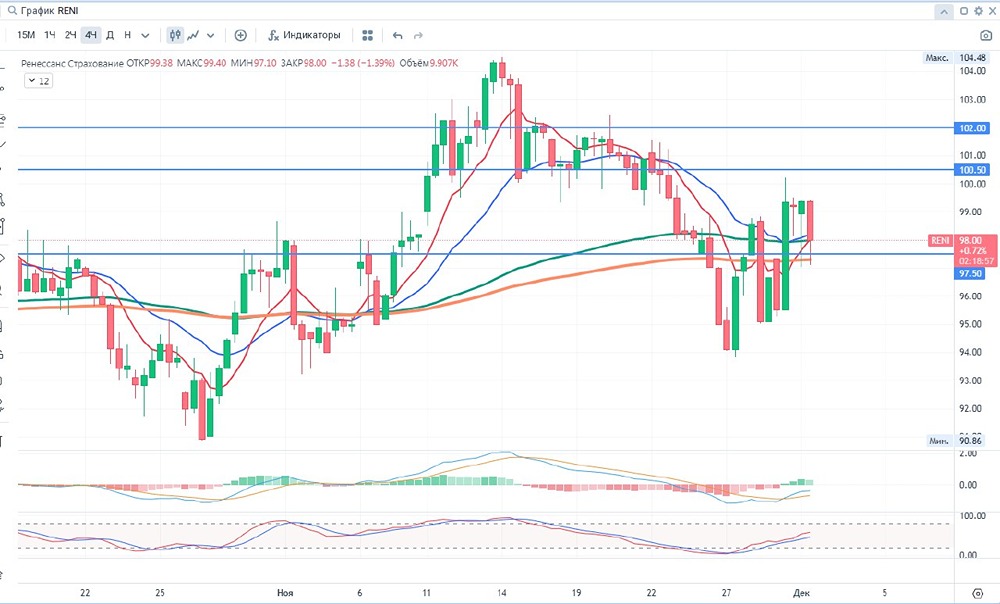 Добрый день уважаемые дамы и господа, инвесторы и трейдеры! Группа Ренессанс страхование является цифровым «революционером» на российском рынке страхования. Компания предоставляет широкий спектр страховых услуг. Группа имеет успешный опыт внедрения инноваций, что обеспечивает дифференциацию от традиционных игроков отрасли и способствует органическому росту бизнеса. Позитив: 1. Увеличение объема страховых премий на 39% за 9 месяцев 2024 2. Планируемая выплата дивидендов в размере 50% от чистой прибыли по МСФО 3. Уровень задолженности уменьшился за 5 лет Негатив: 1. Проблемы с предложением защиты от киберрисков для крупных компаний Дополнительно: 1. Чистая прибыль Группы «Ренессанс» по МСФО за 9 месяцев 2024 года составила ₽4,5 млрд, что на 53,2% ниже, чем в том же периоде прошлого года. 2. Общая сумма брутто подписанных страховых премий выросла на 38,7% год к году и достигла ₽118,2 млрд благодаря увеличению продаж продуктов накопительного страхования жизни, ДМС и автострахования. 3. Совет директоров «Ренессанс Страхование» рекомендовал выплатить дивиденды по итогам 9 месяцев 2024 года в размере ₽3,6 на одну обыкновенную акцию. Дивиденды: Согласно дивидендной политике, Группа Ренессанс cтрахование будет стремиться выплачивать дивиденды в размере не менее 50% от чистой прибыли за год, предшествующий выплате. Решения о размере выплат акционерам будут приниматься с учетом потребностей группы в инвестициях с целью развития бизнеса (включая M&A), достижения ключевых целей стратегии и необходимости соответствовать регуляторным требованиям к достаточности капитала. 💴 - $RENI : ФА Капитализация - 53.8 млрд ₽ Кол-во акций ао– 0.0 млн Кол-во акций ап– 0.0 млн Р/Е - 5.4 P/S - 0.4 P/B - 1.7 ROE - 23.7% EV/EBITDA - 0.0 DSI 0.21 ⏰ - ТФ 1 DAY 🛠 ТА - скользящие, стохастик, объем, МАСD, уровни. 📈- тренд вверх ‼- Гистограмма MACD в отрицательных значениях, линии MACD находятся в положительных значениях. Стохастик находится в районе средней линии, но показывает тенденцию к снижению. Цена опять пересекла снизу вверх 100 ЕМА, ждем закрепления. При закрытии дня ниже 98.59 возможен разворот в шорт. ⏰ -ТФ 4 часа 🛠 ТА - скользящие, стохастик, объем, МАСD, уровни. 📈- тренд вверх ‼ - Гистограмма MACD в положительных значениях, линии MACD находятся в отрицательных значениях. Стохастик находится ниже средней линии , но растет. При закрытии ниже 97.27 возможен разворот в шорт. За 6 (06.24-11.24) месяцев цена снизилась более чем на 10 % . Мин. Рrice = 83,4 Мах. Рrice = 107.24 📌 Цены смены тренда указаны в соответствии с ТФ и являются ориентировочными и со временем смещаются.📌 🃏Всем профита и до скорой встречи!🃏 Мои каналы: БКС https://s.bcs.ru/hua6D Телега https://t.me/ua1cec_trading Дзен https://dzen.ru/ua1cec_trade?share_to=link
