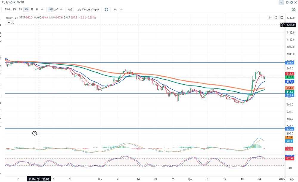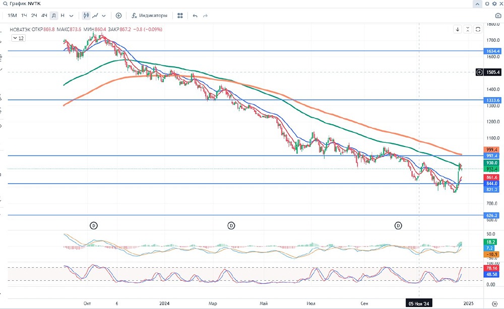 Добрый день уважаемые дамы и господа, инвесторы и трейдеры! 🚨 ПАО «НОВАТЭК» является крупнейшим независимым производителем природного газа в России. Компания занимается разведкой, добычей, переработкой, реализацией природного газа, жидких углеводородов и имеет двадцатипятилетний опыт работы в российской нефтегазовой отрасли. Основные месторождения и лицензионные участки расположены в Ямало-Ненецком Автономном Округе (ЯНАО) в Западной Сибири. ЯНАО является крупнейшим в России регионом по добыче природного газа, на долю которого приходится около 80% российской добычи природного газа и приблизительно 15% мирового объема добычи газа. «НОВАТЭК» реализует природный газ на территории Российской Федерации, а также на экспорт в форме СПГ. ✅Позитив: 📍1. Увеличение тарифов на газ 📍2. Высказывание Путина о планах увеличения доли России на мировом рынке СПГ 📍3. Платит дивиденды ⛔Негатив: 📍1. Возможный рост капитальных затрат. 📍2. Внешние ограничения в виде санкций. 📍3. Отложение сейсморазведки на Южно-Лескинском участке до 2031 📍4. Задержки в строительстве третьей линии завода Arctic LNG 2 📍5. Увеличение налога на прибыль для производителей СПГ 📢Дополнительно: 🥇1. Судоверфь «Звезда» не сможет передать «Новатэку» головной танкер Arc7 для проекта «Арктик СПГ-2» до конца 2024 года, ожидая поставку в начале 2025 года. Второй танкер также будет передан в первом квартале 2025 года. Танкеры могут понадобиться «Новатэку» уже этой зимой, но это зависит от успешности поиска покупателей для грузов. Пока удалось осуществить лишь восемь отгрузок с «Арктик СПГ-2», ни одна из которых не достигла конечного потребителя. Большая часть грузов хранится в плавучих хранилищах и газовозах. 🥈2. Чистая прибыль «Новатэка» по РСБУ за 9 месяцев 2024 года составила ₽242,2 млрд, что на 40,1% ниже по сравнению с ₽404,4 млрд в предыдущем году. 🥉3. Выручка увеличилась на 15,5% до ₽663,6 млрд против ₽574,4 млрд годом ранее. 💵Дивиденды: Дивидендная политика Новатэка: не менее 50% от консолидированной чистой прибыли по МСФО, скорректированной на статьи, не относящиеся к основной деятельности и неденежные статьи. Платят дважды в год. 💴 - $NVTK: ФА Капитализация - 4460.0 млрд ₽ Кол-во акций – 3036.0 млн Р/Е - 9.63 P/S - 3.25 P/BV - 1.72 ROE - 17.9% EV/EBITDA - 5.02 DSI = 0.96 ⏰ - ТФ 1 DAY 🛠 ТА - скользящие, стохастик, объем, МАСD, уровни. 📈- тренд вверх ‼- Гистограмма MACD находится в положительных значения, линии MACD стремятся выйти из отрицательных значений. Стохастик пересек среднюю линию и стремится к зоне перепроданности. 15 ноября 2023 цена пересекла сверху вниз 100 ЕМА и показывает нисходящую тенденцию. При закрытии ниже 844,0 возможен разворот в шорт. Можно ждать попытку пробоя и закрытия выше 930 с движением к 992. В случае закрытия ниже 891 есть вероятность похода до 858-841. ⏰ -ТФ 4 часа 🛠 ТА - скользящие, стохастик, объем, МАСD, уровни. 📈- тренд вверх ‼ - Гистограмма MACD в отрицательных значениях, линии MACD находятся в положительных значениях. Стохастик находится в зоне перекупленности, но выходит из неё. При закрытии ниже 885,8 возможен разворот в шорт. 📊За 6 (06.24-11.24) месяцев цена снизилась более чем на 22 % . Мин. Рrice = 777,2 Мах. Рrice = 1143.0 📌 Цены смены тренда указаны в соответствии с ТФ и являются ориентировочными и со временем смещаются.📌 🃏Всем профита и до скорой встречи!🃏