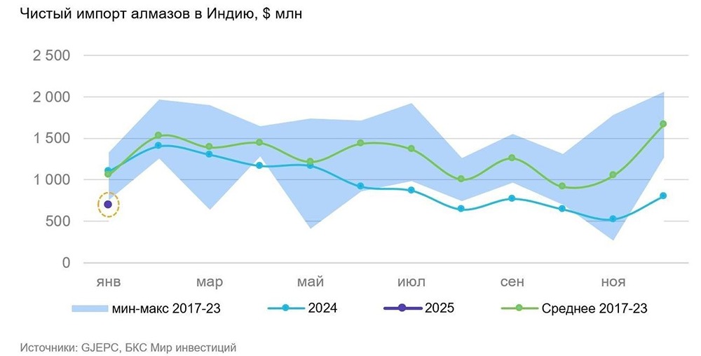 Мнение: БКС Мир Инвестиций Текущая оценка "АЛРОСА" выглядит крайне завышенной В Индии наблюдается снижение объёмов закупок драгоценных камней до многолетних минимумов, как следует из данных, предоставленных Советом по содействию экспорту драгоценных камней и ювелирных изделий Индии (GJEPC). Согласно последним данным о торговле, в январе в страну было импортировано алмазного сырья на сумму 697 миллионов долларов, а объём экспорта сократился до 962 миллионов долларов. Чистый импорт алмазов в Индию упал на 37% год к году и 13% месяц к месяцу до $697 млн — Объемы закупок камней снизились на 32% до 6,6 млн карат — Средняя импортная цена опустилась на 7% до $106 за карат Чистый экспорт бриллиантов из страны скорректировался на 4% и составил $962 млн — Продажи в объемах упали на 9% до 1,2 млн карат — Средняя цена выросла на 6% до $816 за карат. Влияние. Данные указывают на ухудшение ситуации в отрасли. Напомним, что на Индию приходится более 90% мировой огранки алмазов, а торговая статистика дает понимание трендов в индустрии. Январские показатели вновь подтвердили, что признаков восстановления на алмазно-бриллиантовом рынке не видно, а ситуация только продолжает ухудшаться. Оценка: Текущая оценка АЛРОСА выглядит крайне завышенной. Бумаги АЛРОСА в последнее время перестали реагировать на выход слабых показателей в отрасли, а также на укрепление рубля. Несмотря на то, что с начала года цены на алмазы упали более чем на 1,5%, а рубль укрепился примерно на 10%, котировки алмазодобытчика в этот период умеренно росли. В результате акции компании торгуются с неоправданной премией более 50% к историческим средним по мультипликатору Р/Е. Ближайшим триггером для переоценки вниз может стать выпуск слабых финансовых результатов за II полугодие (конец февраля). Источник: www.finam.ru Авторы: Чуйко Кирилл, Казаков Дмитрий, Алиев Ахмед [Не является индивидуальной инвестиционной рекомендацией] В этом сообщении представлено мнение экспертов инвестиционной компании или банка. Оно предоставляется исключительно для ознакомления и не является рекомендацией для покупки или продажи ценных бумаг, а также для принятия каких-либо коммерческих или других решений. mondiara.com не несёт ответственности за содержание этого сообщения и последствия его использования.