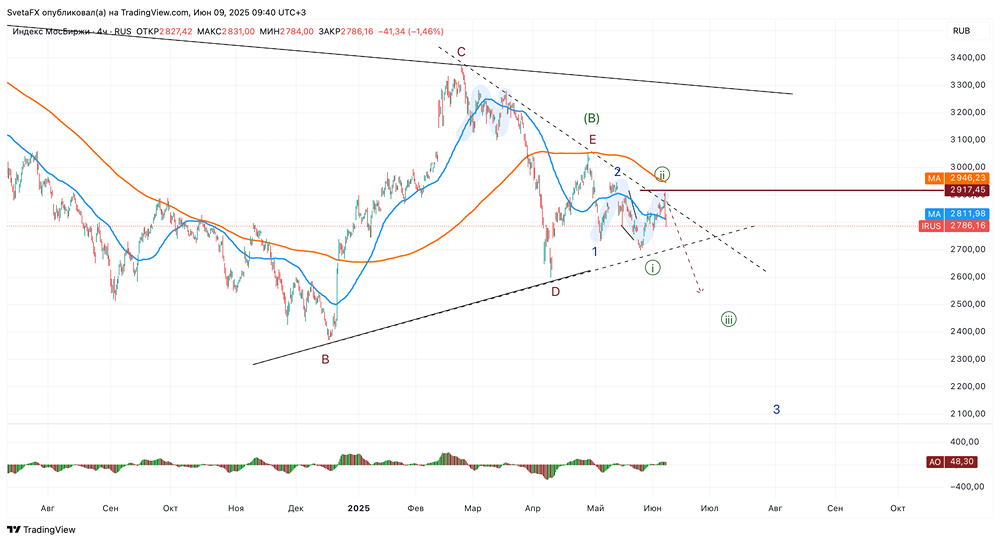 Начнём с того, чем закончили в пятницу. Какое решение по ставке хорошо или плохо для дальнейшего роста фондового рынка и укрепления рубля? Это не имеет значения. Любое решение может быть воспринято рынком негативно, и позже его можно будет обосновать с аналитической точки зрения. Ставка была снижена на 1%. Аналитики тут же сообщили о хороших новостях, и стоимость акций выросла... но лишь на пару минут. Затем что-то пошло не так, и цены развернулись. Самые внимательные сразу же нашли объяснение: Банк России, снизив ставку до 20% годовых, не дал направленного сигнала по денежно-кредитной политике (ДКП) и убрал из пресс-релиза прогноз по инфляции на 2025 год (ранее ожидалось, что она будет на уровне 7–8%). Также ЦБ оставил в заявлении фразу о продолжительном периоде жёсткой ДКП для возвращения инфляции к целевому уровню в 2026 году. По сути, ничего нового. Как вы думаете, может ли такое обоснование быть сигналом к глобальному развороту? Я считаю, что рассматривать рынок с технической точки зрения гораздо выгоднее и интереснее, чем вчитываться в фундаментальные факторы в поисках ответа на вечный вопрос «что же будет дальше». Если цена сформировала серию 1–2 заходных движений вниз, то, согласно этой гипотезе, имеется очень хороший стоп. Если это так, то в ближайшие дни или недели снижение продолжится, а ближе к осени может перейти в обвал. Данный материал носит информационный характер и не является индивидуальной инвестиционной рекомендацией или предложением о покупке или продаже указанной ценной бумаги. Источник: SvetaFX / Trade Waves Public