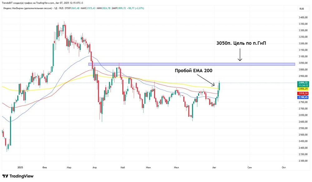 Индекс ММВБ изменил направление. Это разворот! Историческое событие, которое войдёт в анналы как начало нового среднесрочного тренда на российском фондовом рынке. Ключевые моменты: Индекс Московской биржи закрепился в важном диапазоне 2850–2860 пунктов. Если он удержится выше этого уровня, это будет означать формирование полноценного восходящего среднесрочного тренда. ⚡️Сформировалась полноценная модель разворота тренда «пГиП», цель которой — 3050 пунктов. Важно: Индекс пробил ЕМА 200, что может сигнализировать о развороте по индикаторам. ⚫️ Нисходящая тенденция завершена, начинается восходящая. ⚫️ Завершена консолидация, сформировалась модель «пГиП». ⚫️ Происходит закрепление выше ЕМА 200, что может указывать на формирование возможной модели «Золотой крест». ❗️Не пытайтесь идти против тренда! Данный материал носит информационный характер и не является индивидуальной инвестиционной рекомендацией или предложением о покупке или продаже указанной ценной бумаги. [Больше новостей и анализа находятся в нашем мобильном приложение MONDIARA](https://mondiara.com/communities?open=community-17) Скачайте бесплатное приложение в [App Store](https://apps.apple.com/ru/app/m-o-n-d-i-a-r-a/id6475953453) или [Google Play](https://play.google.com/store/apps/details?id=com.mondiara.app) Источник: Trendoman "Торговые сигналы"