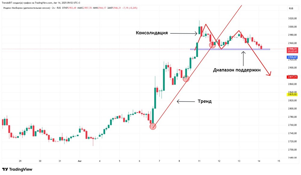 Индекс ММВБ: слабый сигнал, намек на снижение Вчерашнее закрытие торгов показало слабость быков. Попытка преодолеть уровень сопротивления не увенчалась успехом, медведи активизировались и пытаются перехватить инициативу. Есть основания полагать, что коррекция может начаться в районе 2900 пунктов. 🔹 Свечной паттерн: закрытие ниже предыдущей свечи. Тело свечи закрылось ниже предыдущего, что указывает на локальное накопление. Сегодняшняя свеча должна подтвердить этот сигнал. 🔹 Пробой локальной тенденции. Локальный тренд нарушен, давление на поддержку усиливается. Есть вероятность формирования модели «Двойная вершина». 🔹 Сохраняется перекупленность. Индикаторы по-прежнему показывают перекупленность. Участники рынка не готовы покупать по текущим ценам без новых вводных (конкретных ожиданий от переговоров). Важно: Если первый или второй тейк-профит достигнут, стоп-лосс на оставшуюся позицию нужно установить в безубыток (точка открытия позиции). Это обязательное условие! Мне не нравится текущий рынок. Не удалось продавить вверх. НЕ РЕКОМЕНДУЮ ОТКРЫВАТЬ КОРОТКИЕ ПОЗИЦИИ ДО ПРОВЕДЕНИЯ ПЕРЕГОВОРОВ. ______________________________________________ Данный материал носит информационный характер и не является индивидуальной инвестиционной рекомендацией или предложением о покупке или продаже указанной ценной бумаги. ______________________________________________ [Больше новостей и анализа находятся в нашем мобильном приложение MONDIARA](https://mondiara.com/communities?open=community-17) Скачайте бесплатное приложение в [App Store](https://apps.apple.com/ru/app/m-o-n-d-i-a-r-a/id6475953453) или [Google Play](https://play.google.com/store/apps/details?id=com.mondiara.app) Источник: Trendoman "Торговые сигналы"
