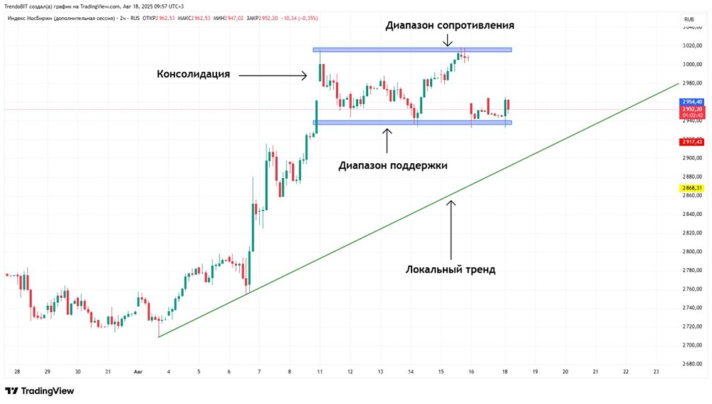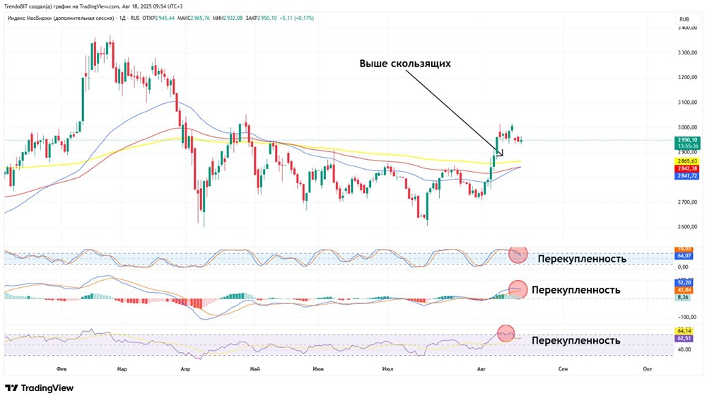 Индекс ММВБ: техническая картина 🔹 Уровни и фигуры: Среднесрочный тренд пока не сформировался, но есть шанс, что мы находимся в процессе его создания. Консолидация продолжается, цель — 3050 пунктов. 🔹 Локально: Сохраняется восходящая тенденция, подтверждённая двумя касаниями. Из-за вертикального роста накоплений не наблюдается (влияет новостной фон). 🔹 Техническая картина. Индикаторы ▫️ Стохастик. Прошла закруглённая форма, выход из зоны перекупленности в сторону перепроданности. Это указывает на локальное снижение. ▫️ RSI. Вышли из зоны перекупленности, идёт коррекционное движение. Важно опуститься до уровня 50. ▫️ Скользящие средние. Цена выше ЕМА50, ЕМА100 и ЕМА200, но золотого креста пока нет. Идёт подготовка. 🔹 Умные деньги После экспирации юрлица остаются на стороне медведей, дисбаланс не изменился, общая картина не изменилась. Умные деньги ожидают дальнейшего снижения. 🔹 Геополитические новости выходных: ▫️ «Очень продуктивно» — госсекретарь США Рубио. ▫️ Подготовка саммита РФ, США и Украины начнётся только при успехе переговоров Трампа с Зеленским в понедельник в Белом доме. ▫️ Переговоры по гарантиям безопасности для Украины начались на прошлой неделе, в них участвуют Вэнс, Рубио и Ермак. 🔹 Вывод: Рынок готов к дальнейшему росту, но предыдущий вертикальный взлёт испортил картину. 99% активов перекуплены, индикаторы указывают на разгрузку и частичную фиксацию. Когда перекупленность будет снята, начну покупать. Старые позиции пока держу. 🔹 Новостной фон продолжит влиять на фондовый рынок. Не пытайтесь найти логику, важна общая картина. ❗️ Держу только длинные (Long) позиции. Планировал фиксировать до встречи, но решил оставить всё (жду формирования нового тренда). Данный материал носит информационный характер и не является индивидуальной инвестиционной рекомендацией или предложением о покупке или продаже указанной ценной бумаги. Больше новостей и анализа находятся в нашем мобильном приложение [m o n d i a r a](https://i.mondiara.com/) Скачать в [App Store](https://apps.apple.com/ru/app/m-o-n-d-i-a-r-a/id6475953453) Скачать в [Google Play](https://play.google.com/store/apps/details?id=com.mondiara.app) Источник: Trendoman "Торговые сигналы"
