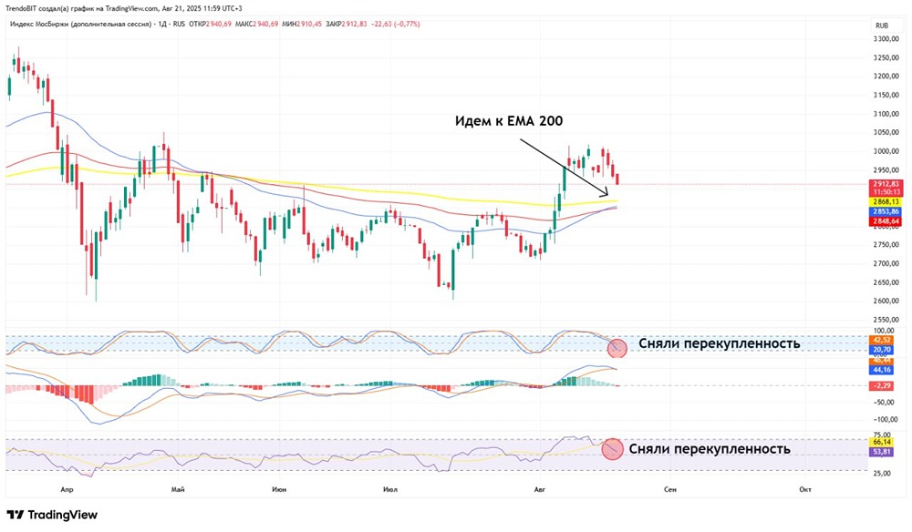 Цена готовится к падению: закрепится ли она? 🔹 Боковая консолидация завершена, как и локальный тренд. Неожиданный, но не меняющий общую картину результат. Текущее снижение — это обычное снятие перекупленности после вертикального роста на ожиданиях переговоров. 🔹 Технически, пробит ключевой диапазон 2930 пунктов. Важно, чтобы цена закрепилась ниже, но вряд ли что-то изменится к закрытию. Индикаторы показывают перекупленность, приближаемся к зоне перепроданности. 🔹 Как я уже говорил в предыдущих разборах, для роста нам нужна полноценная коррекция или постоянный позитивный новостной фон. Но сейчас его нет. 🔹 Все позиции, которые я набрал, буду удерживать. 🔹 Цель снижения по накоплению — 2850 пунктов. По индикаторам — ЕМА 200. Не факт, что мы до неё дойдём. Открывать короткие позиции не планирую. Это снижение буду использовать для новых покупок и доборов. Данный материал носит информационный характер и не является индивидуальной инвестиционной рекомендацией или предложением о покупке или продаже указанной ценной бумаги. Больше новостей и анализа находятся в нашем мобильном приложение [m o n d i a r a](https://i.mondiara.com/) Скачать в [App Store](https://apps.apple.com/ru/app/m-o-n-d-i-a-r-a/id6475953453) Скачать в [Google Play](https://play.google.com/store/apps/details?id=com.mondiara.app) Источник: Trendoman "Торговые сигналы"