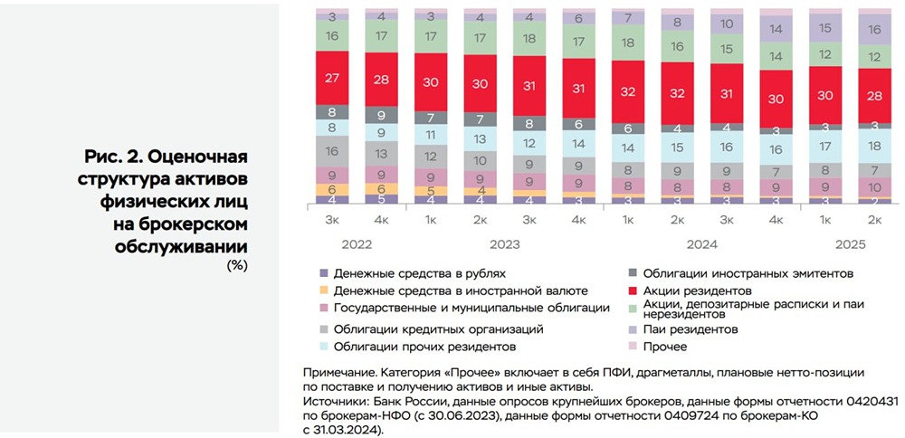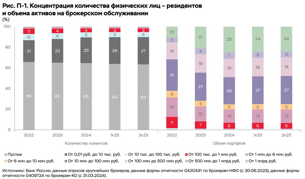 Статистика брокеров за II квартал 2025 года 🔹 Банк России подготовил обзор ключевых показателей российских брокеров за второй квартал 2025 года. В документе представлены интересные данные. 🔹 Общее число розничных инвесторов составило 37,2 млн человек, что на 3% больше, чем в прошлом квартале, и на 15% — чем год назад. 🔹 Из них 5,1 млн инвесторов имеют активы на счетах. Этот показатель вырос на 3% по сравнению с предыдущим кварталом и на 8% — в годовом выражении. 🔹 Активы розничных инвесторов достигли 11 трлн рублей. Доля облигаций в их портфелях выросла до 35%, что является максимальным уровнем с конца 2020 года. ❗️ Доля вложений в российские акции снизилась до 28%, что является минимальным значением с конца 2022 года. 🔹 Совокупная стоимость активов физических лиц на брокерском обслуживании (ценные бумаги, денежные средства, требования за вычетом обязательств, включая индивидуальные инвестиционные счета) составила 11 трлн рублей. Это на 3% больше, чем в предыдущем квартале, и на 17% — чем год назад. Из этой суммы около 10,3 трлн рублей приходилось на ценные бумаги, а 0,4 трлн рублей — на денежные средства в рублях и иностранной валюте. 🔹 Средний размер брокерского счета у физических лиц-резидентов практически не изменился и составил 2,2 млн рублей. ❗️ Рост числа клиентов с активами наблюдался в сегменте средних обеспеченных инвесторов (от 6 млн до 100 млн рублей) — на 6% по сравнению с предыдущим кварталом. В массовом сегменте (от 100 тысяч до 1 млн рублей) число клиентов выросло всего на 2%. 🔹 В сегменте состоятельных инвесторов (от 100 млн рублей) после небольшого снижения в предыдущем квартале снова начался рост: число клиентов увеличилось с 11,4 до 11,8 тысяч человек, а объем их портфелей — с 5,1 до 5,3 трлн рублей. Больше новостей и анализа находятся в нашем мобильном приложение [m o n d i a r a](https://i.mondiara.com/) Скачать в [App Store](https://apps.apple.com/ru/app/m-o-n-d-i-a-r-a/id6475953453) Скачать в [Google Play](https://play.google.com/store/apps/details?id=com.mondiara.app) Источник: Павел Шумилов