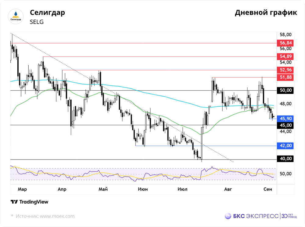 Мнение: БКС Экспресс Прогноз по акциям компании "Селигдар" Акции «Селигдара» в четверг потеряли 1,6%, опустившись до 46 рублей. Объем торгов превысил средний уровень — 212 миллионов рублей. Сегодня утром бумаги выросли на 0,2% по сравнению с закрытием четверга. 🔹 Краткосрочная перспектива • С начала месяца акции падают в цене. Индекс МосБиржи демонстрировал смешанную динамику: в ходе основной сессии он вырос на 0,21%, а на вечерних торгах — на 0,05% по сравнению со средой. • В конце августа акции достигали 51,9 рубля, но сейчас котировки снизились более чем на 11%. Покупатели ежедневно компенсируют часть дневных потерь на дополнительных сессиях, однако общая нисходящая тенденция сохраняется. • На недельном графике сформировались два медвежьих паттерна подряд, и текущая неделя может завершиться в значительном минусе. Во время снижения акции потеряли важный уровень поддержки — 200-дневную скользящую среднюю. На дневном графике предыдущие две свечи имели длинные нижние тени, что может указывать на возможное замедление падения. Ориентировочная зона интереса покупателей — уровень 45,9 рубля. • Объемы торгов выросли в конце прошлого месяца. Рост цен на золото до исторических максимумов не привел к увеличению стоимости акций «Селигдара», что подтверждает ранее выявленную тенденцию. Новости о росте запасов золота компании также не оказали влияния на котировки. • Индекс относительной силы (RSI) находится в нейтральной зоне на большинстве графиков. Акции торгуются ниже 200-дневной скользящей средней на всех таймфреймах. 🔹 Внешний фон В четверг S&P 500 вырос на 0,83%. Сегодня утром фьючерсы на S&P 500 в плюсе на 0,1%. Азиатские индексы преимущественно растут. На мировых рынках золото подорожало на 0,3% до $3557 за унцию. Уровни сопротивления: 50, 51,9, 53 Уровни поддержки: 45,9, 45, 42 🔹 Долгосрочная перспектива • С августа 2020 года по май 2023 года акции колебались в диапазоне 40–50 рублей. В течение следующих четырех месяцев они выросли более чем на 80%, достигнув исторического максимума в 92,35 рубля. • С апреля 2024 года началась коррекция, которая продолжалась около восьми месяцев. После падения до 35 рублей акции начали расти, но восстановились лишь до 60 рублей. В ходе следующей коррекции уровень поддержки 40 рублей был удержан, после чего возобновился восходящий тренд. • На акции влияют неоднозначные финансовые результаты и внутренняя неопределенность компании, что не всегда позволяет следовать за ростом цен на золото. В то же время производственные мощности расширяются, а цена на драгметалл остается высокой. Фундаментальные факторы в целом смешанные. • В настоящее время акции консолидируются ниже 200-дневной скользящей средней. Автор: Смирнов Андрей Данный материал носит информационный характер и не является индивидуальной инвестиционной рекомендацией или предложением о покупке или продаже указанной ценной бумаги. Больше новостей и анализа находятся в нашем мобильном приложении [m o n d i a r a](https://i.mondiara.com/) Скачать в [App Store](https://apps.apple.com/ru/app/m-o-n-d-i-a-r-a/id6475953453) Скачать в [Google Play](https://play.google.com/store/apps/details?id=com.mondiara.app) Источник: bcs-express.ru