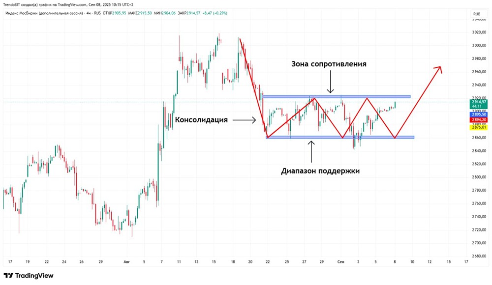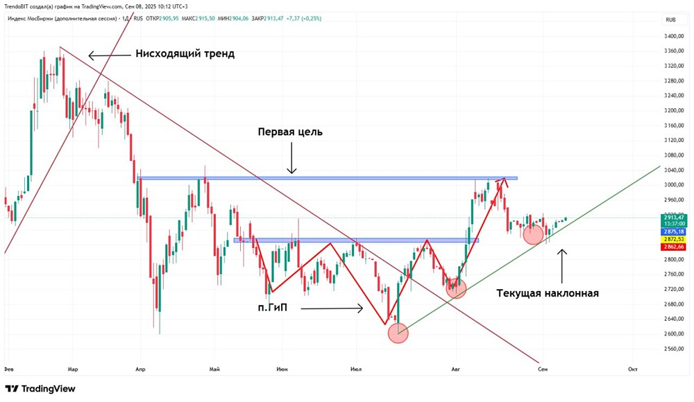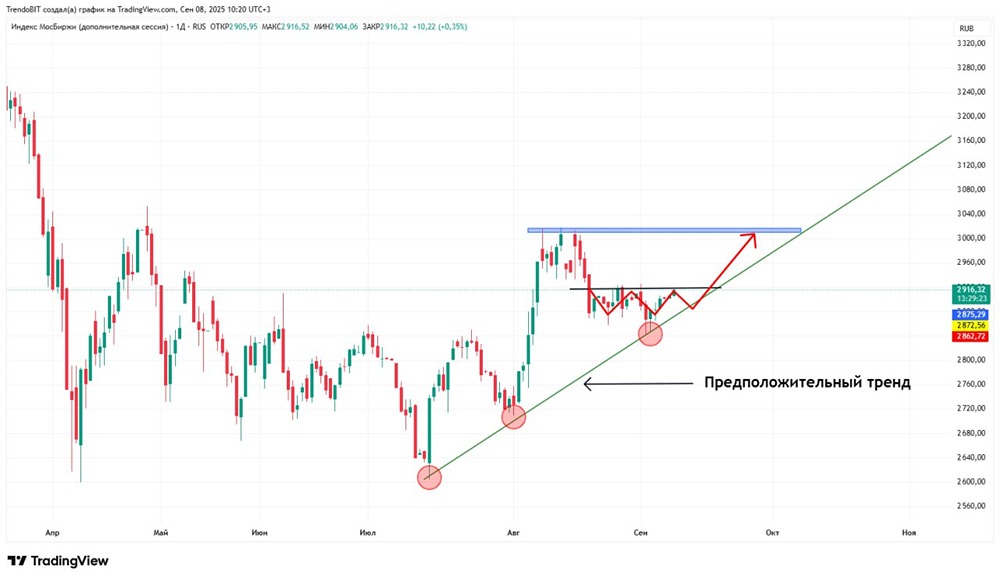 На этой неделе мы обсудим важные новости, техническую картину рынка и движение умных денег Техническая картина 🔹 Среднесрочный тренд пока не сформировался, но есть вероятность его появления. Консолидация продолжается, и цель остается на уровне 3050 пунктов. Ждем третье касание для подтверждения наклонной. 🔹 Локально мы находимся в консолидации с 21 августа. Возможно формирование паттерна «Прямоугольник». Обратите внимание на ложные пробития: для выхода из консолидации нужны объемы. Индикаторы 🔹 Stochastic показал локальную консолидацию в зоне перепроданности, за которой последовали закругление и разворот. Это говорит о возможном росте. 🔹 RSI находится на средних значениях, и из-за отсутствия объемов основное направление пока не определено. 🔹 Скользящие средние (ЕМА 50, 100 и 200) защищают текущий диапазон. Ждем формирования модели «Золотой крест». Умные деньги 🔹 После экспирации юрлица продолжают поддерживать медведей. Дисбаланс не меняется, и умные деньги ставят на продолжение снижения. Геополитика 🔹 Трамп заявил о готовности США продолжать военные операции в Карибском бассейне. 🔹 ОПЕК+ согласилась на увеличение добычи нефти на 127 тысяч баррелей в сутки в октябре. 🔹 Россия и США работают над организацией встречи законодателей на нейтральной территории. 🔹 Зеленский отклонил предложение Путина приехать в Москву на переговоры, но готов к встрече в любом формате. Вывод 🔹 Все факторы указывают на готовность рынка к росту. Единственное, что может помешать, — геополитика. Любые просадки я буду использовать для добора позиций. Цель по индексу остается на уровне 3060 пунктов. Рынок среднесрочно развернулся, глубокого погружения ждать не стоит. 🔹 На этой неделе состоится заседание ЦБ. Я ожидаю снижения ставки на 2%, но важна не только ставка, но и риторика. Данный материал носит информационный характер и не является индивидуальной инвестиционной рекомендацией или предложением о покупке или продаже указанной ценной бумаги. Больше новостей и анализа находятся в нашем мобильном приложение [m o n d i a r a](https://i.mondiara.com/) Скачать в [App Store](https://apps.apple.com/ru/app/m-o-n-d-i-a-r-a/id6475953453) Скачать в [Google Play](https://play.google.com/store/apps/details?id=com.mondiara.app) Источник: Trendoman "Торговые сигналы"