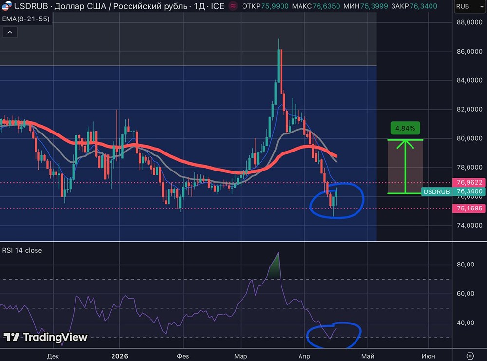 Обзор доллар/рубль. Мы получаем пятый раз за последний год отбивку от этого диапазона (75.17–76.96). Сейчас в довесок мы получили самый чистый RSI(D) сигнал. Игнорировать такое нельзя. Лично я иду в валютную экспозицию. Цель ставлю под 80 руб. (думаю, что довольно быстро дойдем туда). Из инструментов валютной экспозиции выделяю следующие: 1. SBCB (конечно же, мой любимый фонд на евробонды, см. второй график — там супер красивая отбивка с диапазона и также RSI(D) работает). 2. GLDRUB_TOM (но тут уже появляется больше риска — см. третий график). В целом, разворот золота выглядит очень позитивно (нужно именно GOLD смотреть): отбивка от Фибы + RSI(D) + EMA в пучке. Однако, первые два фактора уже не первой свежести — они были 2–3 недели назад. Сейчас из свежего только скользящие. Но все равно выглядит очень позитивно. Итого: золото + девал = рост GLDRUB_TOM. Но еще раз! Здесь больше риска, чем в SBCB! Техника показывает все моменты по активам. Не нужно иметь специальное образование. Достаточно следовать простому набору правил. На следующей неделе я проведу марафон специально для новичков по тех. анализу — расскажу эти правила, покажу стратегию, объясню доступно. Регу открою на выходных. Данный материал носит информационный характер и [не является индивидуальной инвестиционной рекомендацией](https://mondiara.com/communities?open=community-1163) или предложением о покупке или продаже указанной ценной бумаги. Источник: InveStory