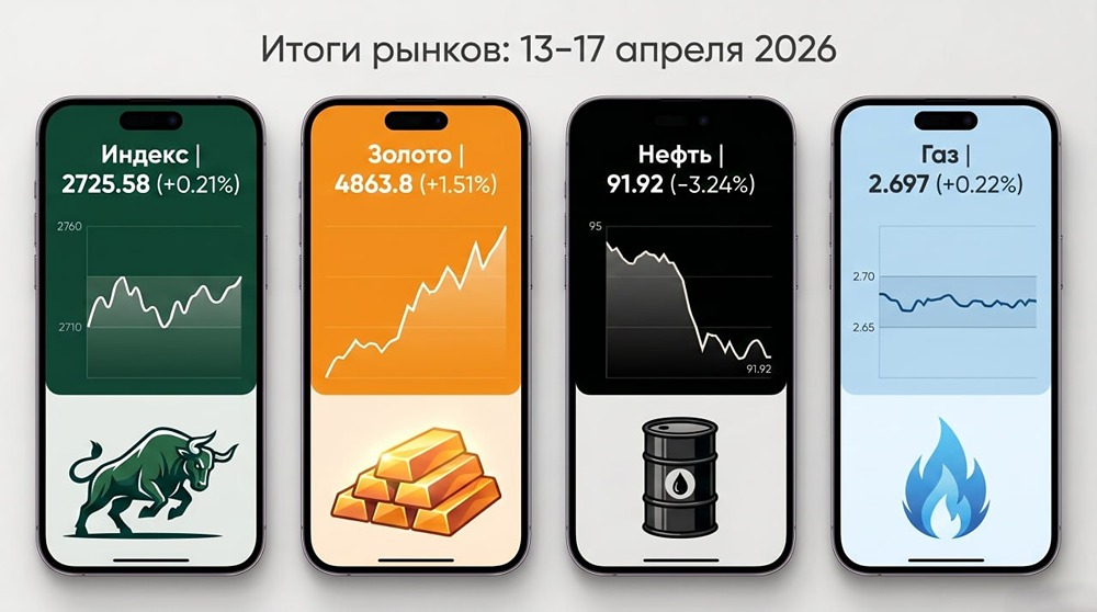 Подведём итоги прошедшей недели 13–17 апреля. Рынок провёл её относительно спокойно: индекс немного подрос, золото обновило локальные вершины, а нефть и газ консолидировались после резких движений последних недель. Индекс Мосбиржи Итог торгов 17.04.2026 23:00 мск: 2725.58п (2719.75п неделей ранее, +0,21% за неделю). Внутри недели индекс в основном двигался в коридоре около 2710–2760п: попытки снижения к 2710–2720п выкупались, а в районе 2750–2760п активность продавцов усиливалась и не пускала цену выше. В итоге индекс закрепился чуть выше уровней прошлой недели, но без уверенного выхода из консолидации, что скорее говорит о паузе после прошедшей коррекции. Базовый сценарий на ближайшую неделю — это продолжение торговли в диапазоне 2700–2760п при высокой чувствительности к новостям по сырью и геополитике. Золото Итог торгов 17.04.2026 23:00 мск: 4863.8п (4791.6п неделей ранее, +1,51% за неделю). Золото продолжило рост и обновило локальные максимумы, оставаясь вблизи одномесячных вершин. Спрос на защитные активы поддерживается общим фоном неопределенности и колебаниями на сырьевых рынках. На горизонте недели базовый вариант — это сохранение интереса к золоту и торговля в верхней части текущего диапазона с риском кратких коррекций после серии ростовых недель. Нефть Brent Итог торгов 17.04.2026 23:00 мск: 91.92п (95.0п неделей ранее, −3,24% за неделю). Нефть продолжила охлаждаться после недавнего ралли: котировки опустились в район чуть ниже 95 и, по данным зарубежных площадок, в какие-то моменты недели проседали до 89–92 долларов за баррель по Brent на фоне сообщений о частичном открытии Ормузского пролива и объявлении режима прекращения огня в районе пролива. Объявленное перемирие и восстановление судоходства снимают часть прежнего запаса в ценах, рынок больше смотрит на баланс спроса и предложения, а не только на угрозы поставкам. Для российского рынка это означает более спокойный фон для нефтянки и отсутствие прежнего мощного импульса сверху, хотя сами уровни цен по-прежнему остаются комфортными для сектора. Природный газ Итог торгов 17.04.2026 23:00 мск: 2.697п (2.691п неделей ранее, +0,22% за неделю). Газ провел неделю практически в боковике: после предыдущего снижения котировки консолидируются в районе 2.65–2.70п без ярко выраженного тренда. Сезонный фактор и ожидания более мягкого баланса спроса и предложения не дают рынку повода для новой волны роста, но и продавцы пока не усиливают давление. Для российского фьючерса #NGG2026 это выглядит как стабилизация после сезонной коррекции и переход к весенне-летнему режиму. Геополитический фон и влияние на активы Сообщения о прекращении огня и частичном открытии Ормузского пролива снижают риски резких сбоев поставок нефти и газа, поэтому именно нефть реагирует наиболее заметным охлаждением, тогда как газ в большей степени следует сезонной логике. На этом фоне золото, наоборот, сохраняет поддержку как защитный актив, отражая общий спрос на страховку от возможных новых всплесков напряженности и колебаний на рынках. Для российского рынка связка выглядит так: индекс немного отскакивает после коррекции, но без нового драйвера роста со стороны нефти и при этом получает частичную опору от спокойного сырьевого фона и интереса к защитным инструментам. Данный материал носит информационный характер и [не является индивидуальной инвестиционной рекомендацией](https://mo