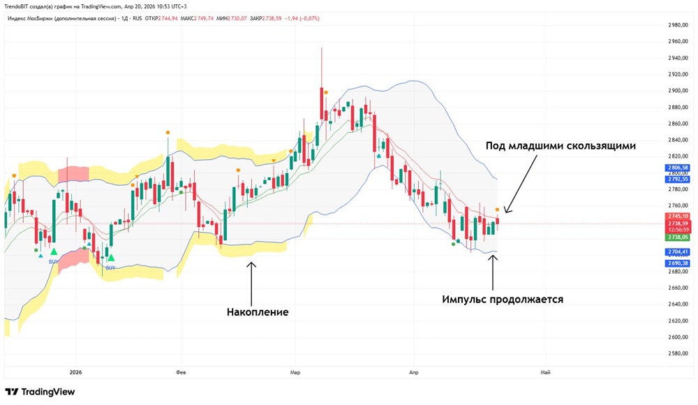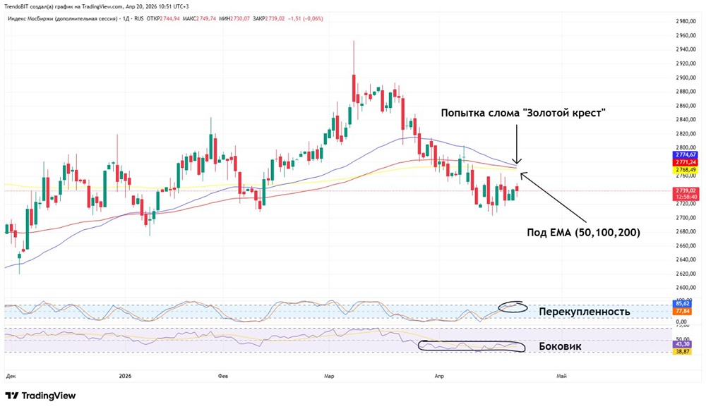 Наша постоянная рубрика: что ждать на текущей неделе, какая техническая картина нас ждёт, ну и какие важные новости вышли за выходные и как они могут повлиять на движение российского рынка, а также на чьей стороне находятся умные деньги. Техническая картина ЛОКАЛЬНО: Сохраняется нисходящий локальный тренд, цена находится под наклонной, цель 2700п взяли, сейчас ждем продолжения консолидации. Пробой одного из уровней задаст импульс (больший % вероятности сходить еще ниже). Среднесрочно: По-прежнему отсутствует среднесрочный тренд, ждем формирования наклонной. А пока ориентир на локальный. Техническая картина. Индикаторы: ➥ Stochastic. В зоне перекупленности. Цена не растет, это называется плоская коррекция. ➥ RSI. Попытки отскока от зоны перекупленности, небольшая дивергенция на рост. ➥ Скользящие средние. Цена под ЕМА200, 100 и под ЕМА50. Есть вероятность, что модель «Золотой крест» будет сломана. Умные деньги: после экспирации юр. лица по-прежнему находятся на стороне медведей, дисбаланс не меняется, перевес по-прежнему на стороне медведей. Умные деньги ставят на продолжение снижения. Геополитика, новости, которые вышли на выходных: — ВМС США ПОЛУЧАТ СИЛЬНЫЙ УДАР, ЕСЛИ АТАКУЮТ ИРАНСКИЕ СУДА — ВМС КСИР. — В воскресенье ни один танкер не пересек Ормузский пролив. — ИРАН ОТКАЗАЛСЯ ОТ УЧАСТИЯ ВО ВТОРОМ РАУНДЕ ПЕРЕГОВОРОВ С США — IRNA. — Вице-президент США Джей Ди Вэнс не поедет в Исламабад на переговоры по Ирану. Вывод: Покупать на падающем рынке нельзя. Каждый последующий максимум ниже предыдущего, торговать рекомендую исключительно по тренду. Приступать к покупкам рано. Если рассматривать спекуляции, работать только с короткими или сидеть в кэше. Данный материал носит информационный характер и [не является индивидуальной инвестиционной рекомендацией](https://mondiara.com/communities?open=community-1163) или предложением о покупке или продаже указанной ценной бумаги. Источник: Trendoman "Торговые сигналы"