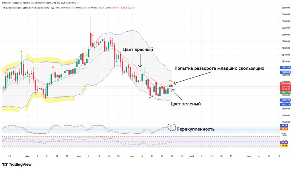 Вчера рынок пытался показать силу, были попытки отскока, многие уверовали в разворот, но не учли важные моменты, которые стоит рассматривать в совокупности. Важно: были попытки разворота младших таймфреймах, это показывали скользящие (ЕМА 9–15) на индикаторе, но пока без подтверждения. Что нужно для подтверждения разворота? ➥ StochRSI по-прежнему в зоне перекупленности. Рассчитывать, что покажем силу в данном диапазоне, это маловероятно (только если будет новостной фон). ➥ Нисходящая линия тренда сохраняется, это самое важное! Запомните, тренд проще продолжить, чем сменить. Слом тренда смотрим только в моменте. ➥ Ну и какой разворот без накопления. V-образных разворотов не бывает (если нет новостей). У нас проходит локальное боковое накопление, сейчас у верхнего диапазона. Чтобы развернуться, нужно пробить данный диапазон вверх. Итог: попытки развернуть локальный тренд проходят, но ВСЕ ОБЯЗАТЕЛЬНЫЕ УСЛОВИЯ НЕ ВЫПОЛНЕНЫ! Пока этого не случится, приступать к покупкам нельзя! Пока никуда не торопимся, все важные уровни сопротивления продолжают действовать, как и тренд. Данный материал носит информационный характер и [не является индивидуальной инвестиционной рекомендацией](https://mondiara.com/communities?open=community-1163) или предложением о покупке или продаже указанной ценной бумаги. Источник: Trendoman "Торговые сигналы"